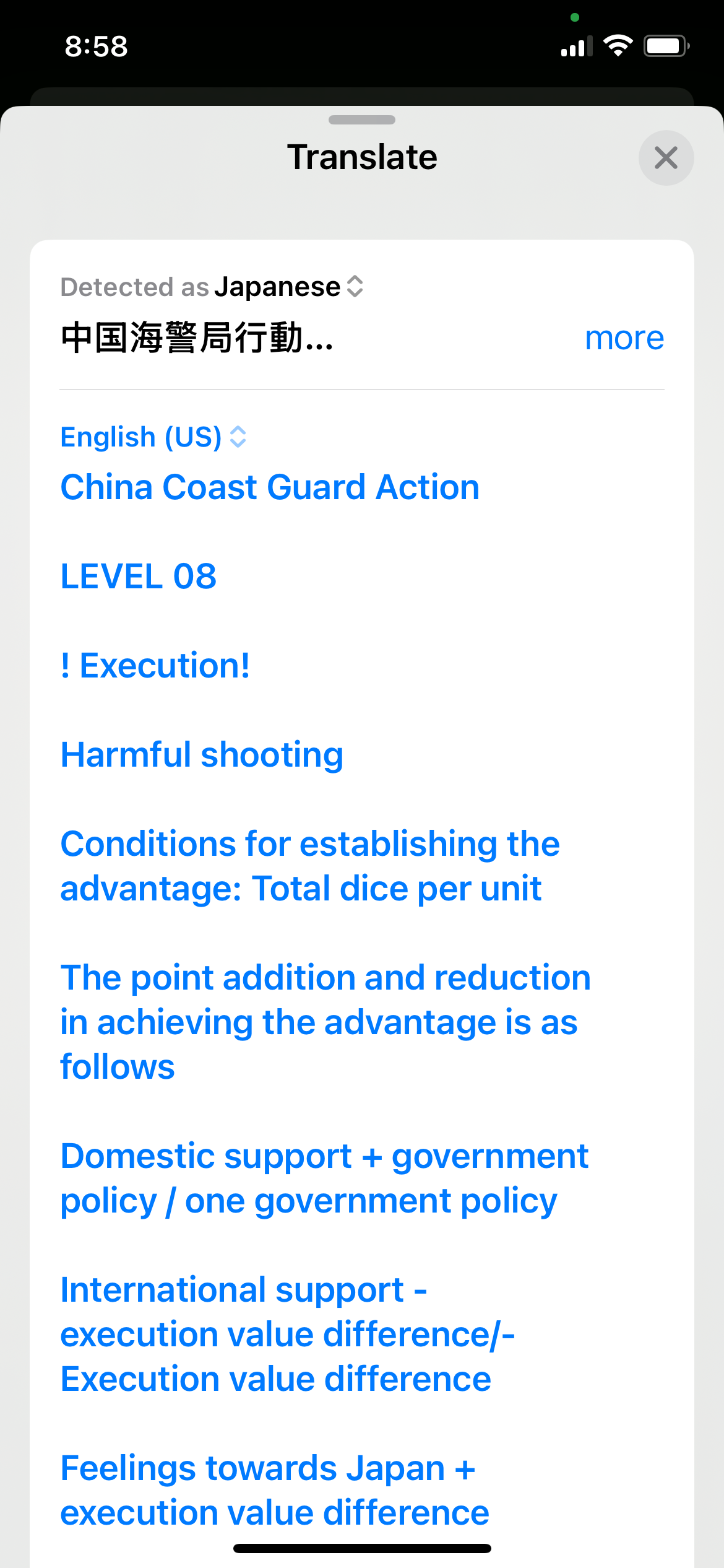 Honestly, the hardest part of playing Maritime Police vs. Coast Guard was before game play. As the game materials are all in Japanese they required translation. The rule book, available in a pdf file, was not hard to run through the various AI translators and then edit. The map was not that hard to use as only a few locations need be annotated. The counters were a mixed-blessing; the identifier numbers on PRC ships make them easy to read but the name-only Japanese ships were a bit of a challenge to read. Not impossible, just challenging. The Incident and Escalation cards were harder as each needed to be done separately and “new” card produced in English. (Some examples of my translation processes are shown below.)