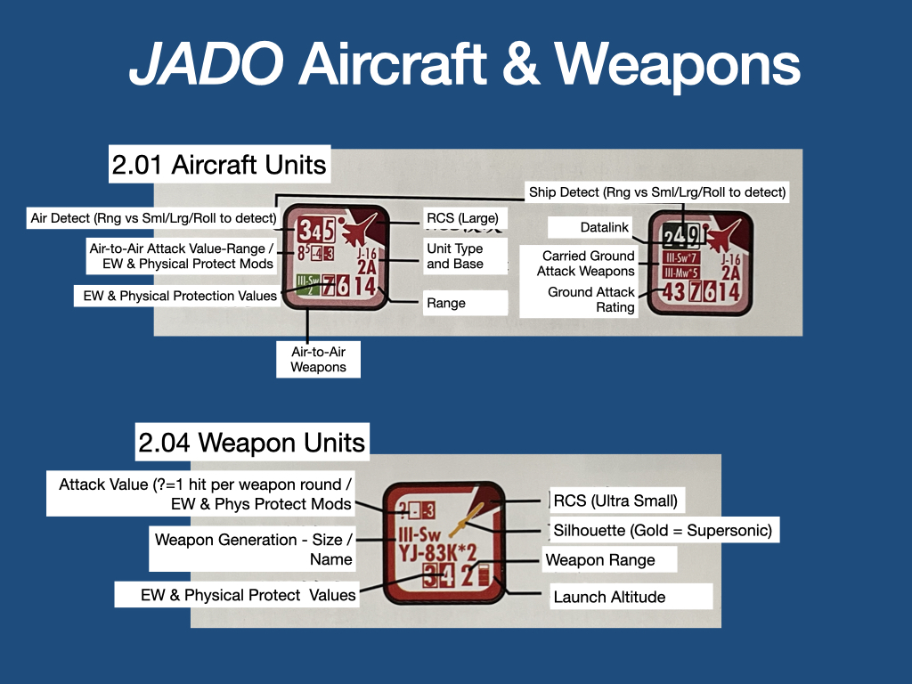 One common design mechanism from the beginning of wargaming is the counter/miniature on the floor or table is the visual representation of a unit with the associated “values” held separately in a table or book or the like. In early commercial wargames many values moved to the counter; see the common Attack-Defense-Movement values in many wargames. As the hobby progresses, an enduring challenge is finding a balance between too little or too much information on a counter. A recent example in my collection featuring counters for a wargame that are very “data dense” is Joint All Domain Operation (JADO) from War Drum Games (2024). In JADO the 1/2″ counters are often crowded, on both sides, with lots of information (and even then an off-board log is needed for weapons).