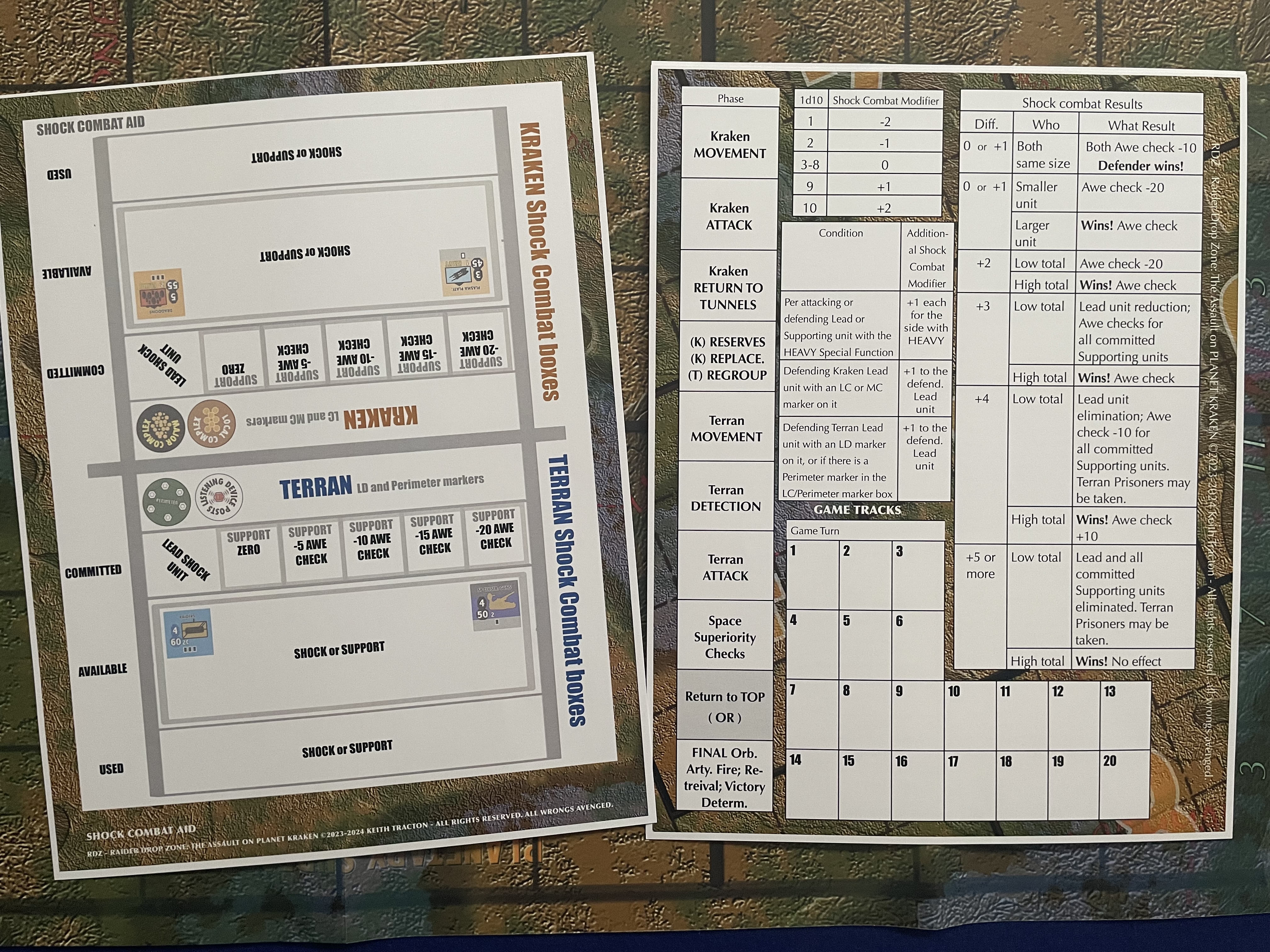 The second Player Aid for Raider Drop Zone has the Game Turn track, the turn Phase track, and the three Shock combat tables (Shock Combat Modifier, Shock Value Modifier, and Shock Combat Results). After playing just a few combat rounds (maybe even only one) the first two tables will likley be ignored as they are very simple to understand and apply. The Shock Combat Results Table is the one that will likely be referenced every combat, but as the game progresses players will very likely apply the results faster as they understand the game mechanisms. On balance, however, the (very) few tables do not slow game play at all; indeed, the Player Aid greatly assists in speeding up play.