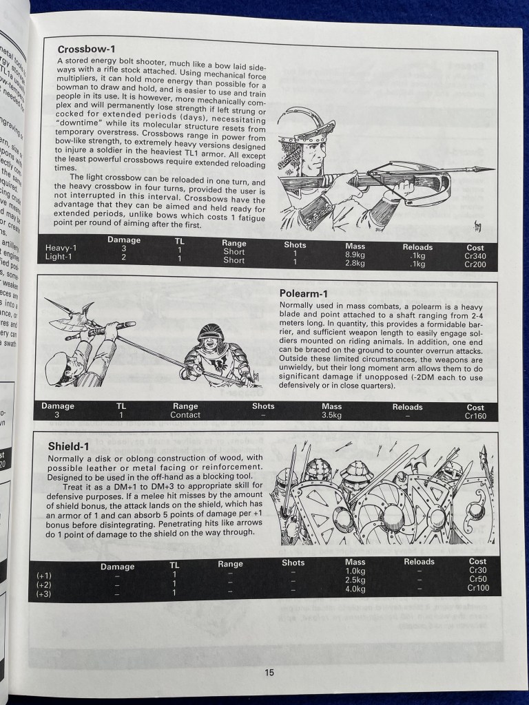 Emperor’s Arsenal is written as though in-universe under the name Carnak’s Surface Weapons. The softcover book is really a listing of weapons arranged by Tech Levels; think from spears to very futuristic energy weapons. Weapon entries in Emperor’s Arsenal give Damage / Tech Level / Range / Shots / Mass or Volume / and Cost when appropriate. Today this data would be in an online wiki or the like but “back in the day” a book such as this was “luxurious” though with only a bit of some color in the form of Chris Foss artwork on the cover. The interior black & white artwork predates today’s AI-generated artwork and provides a bit of some character for the book that helps immerse players into the setting.