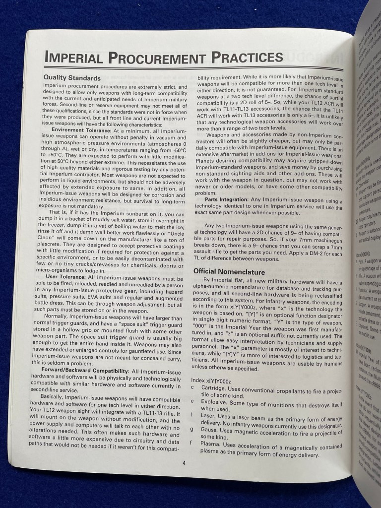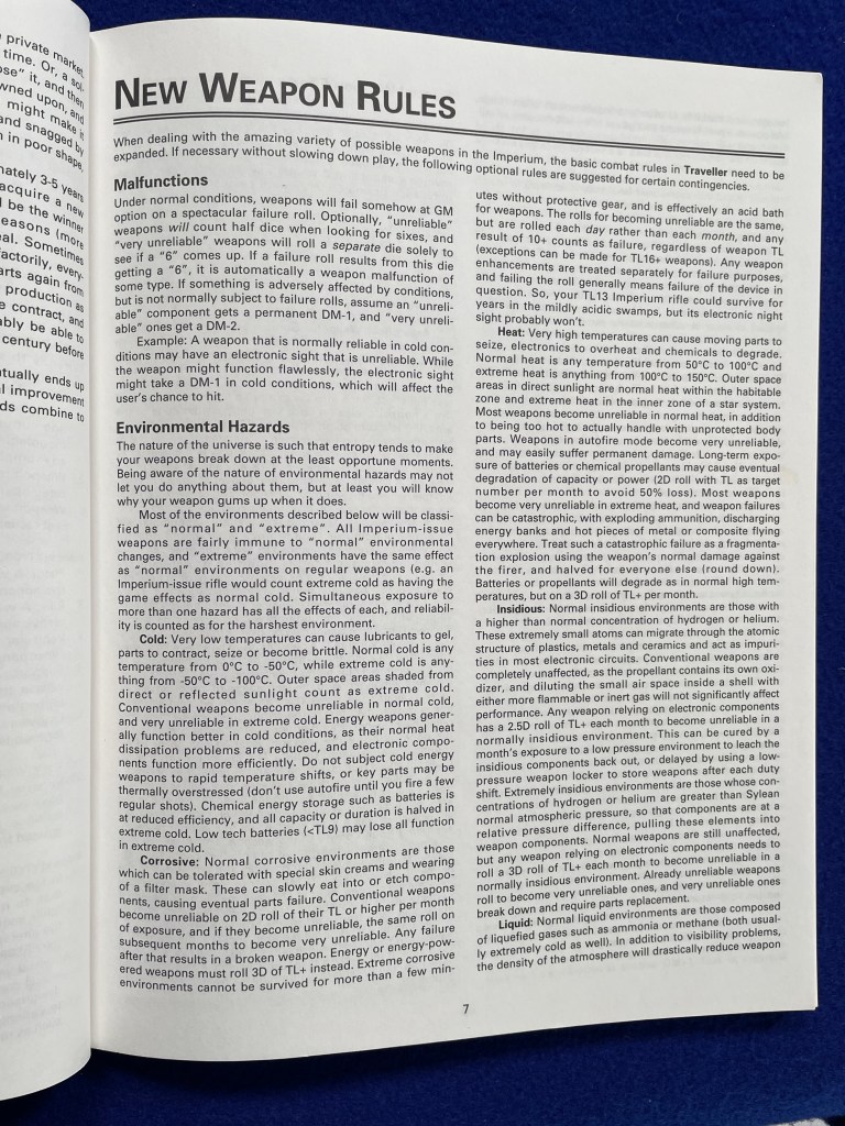 Emperor’s Arsenal had some great stuff in it . I think the chapter of additional rules from page 7 is unsurpassed in all published canon for bringing a bit more crunch to combat. For example, the rules on using personal scale weapons against starships (and vice versa) on page 11 are so elegant and yet CT-MT-TNE had floundered about trying to manage such combat. Likewise the rules for torpedoes.
