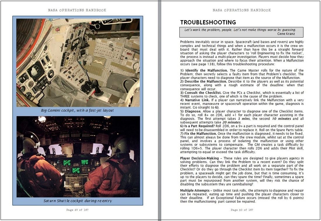 The advice goes on to recommend that GMs make sure the conflict is obvious to players using mechanisms like the Troubleshooting process noted above. It also mentions using resource management (air, power, propellant) as a way to add drama. It ends with this very useful passage: