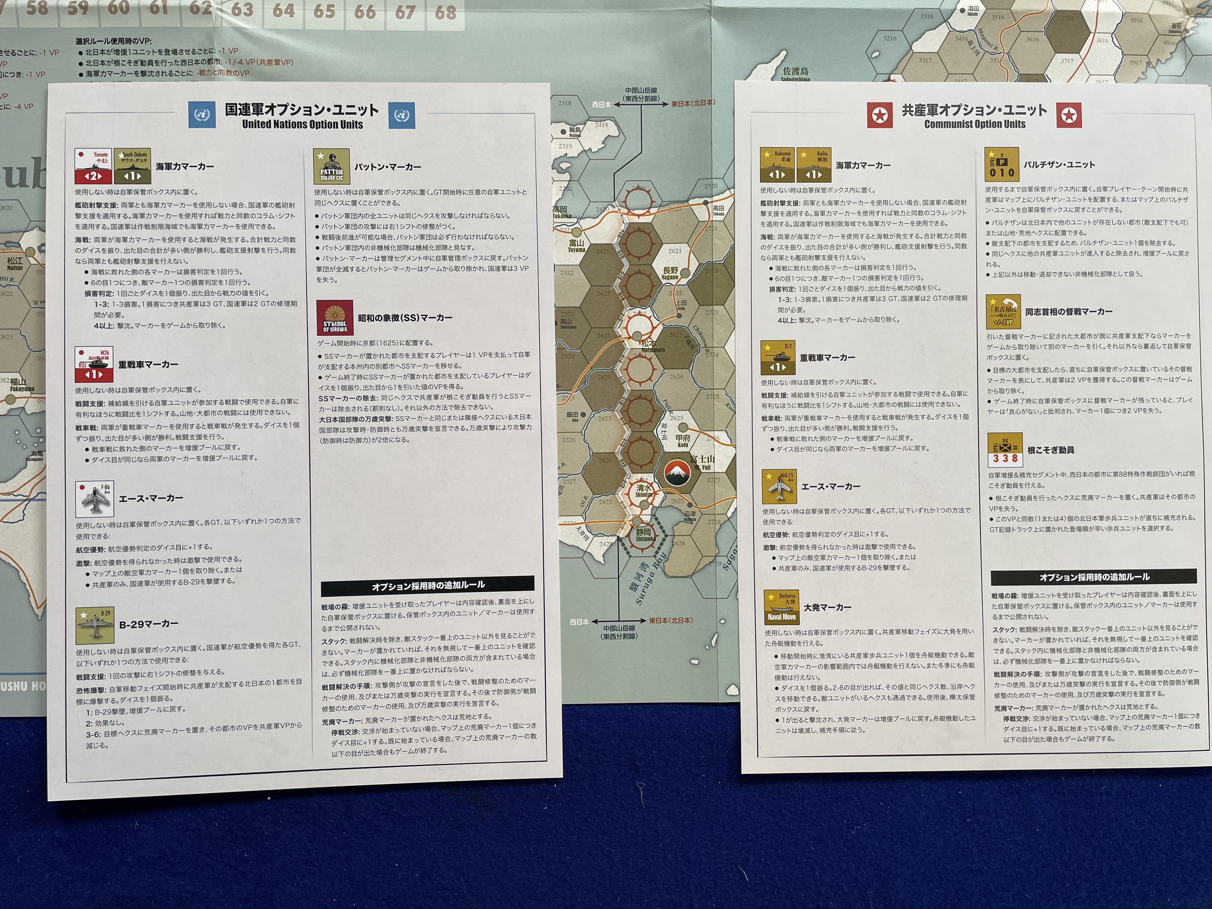 The following are optional rules for playing THW in a more enthusiast-oriented way. When using optional rules, during initial setup, add three Greater Japan units marked with a ● in the upper left and three U.S. units marked with a ☆ to the reinforcement pool. Additionally, place 13 North Japanese units marked with a ★ in the upper left into a newly prepared Communist reinforcement pool. During each Communist Replenishment & Reinforcement Segment starting from GT 1, the Communist player can spend 1 VP to randomly draw one reinforcement unit. Unlike the UN forces, only one North Japanese reinforcement unit can appear per GT.