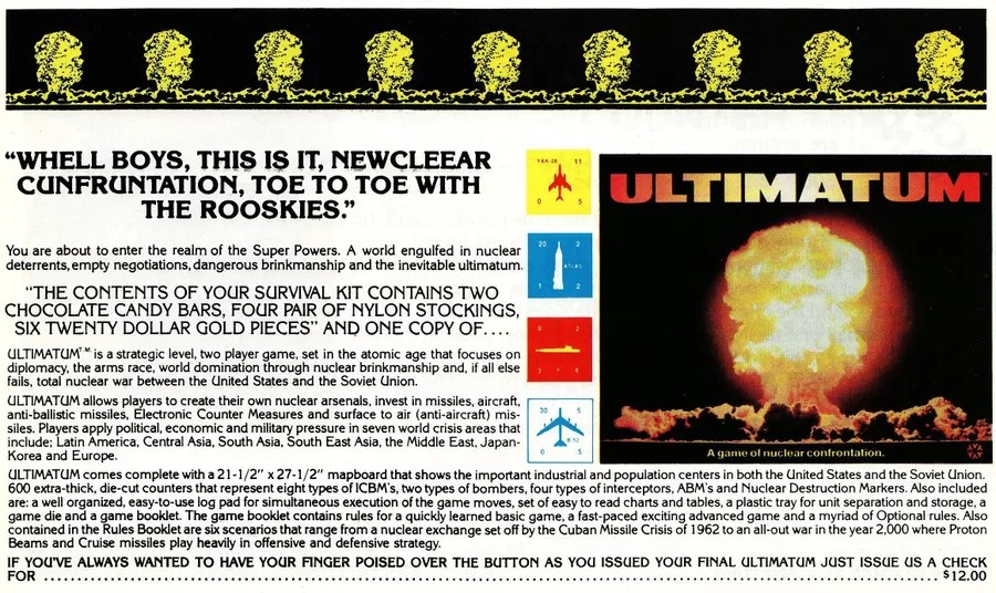 - Ultimatum: A Game of Nuclear Confrontation (1979) Designer: J. Michael Hemphill. Artist: J. Stephen Peek. Publisher: Yaquinto.