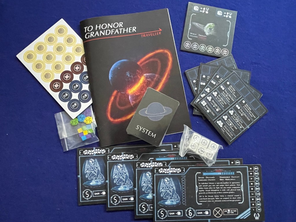 While To Honor Grandfather is heavily themed around Traveller, the reality of gameplay is that the game could just as easily be played with a simple set of d6. If you look at the photos above you might see that each face of the die has a certain number of pips around the caste symbol in the middle; six die faces for sides with 1-6 pips. If I have a complaint it is perhaps the fact that the rulebook and player aids talk in terms of even, odd, or sequential die faces yet nowhere does it state that each caste is associated with a particular number. Most players likely will figure it out themselves, like I did, pretty quickly but it is a potential learning obstacle for some.