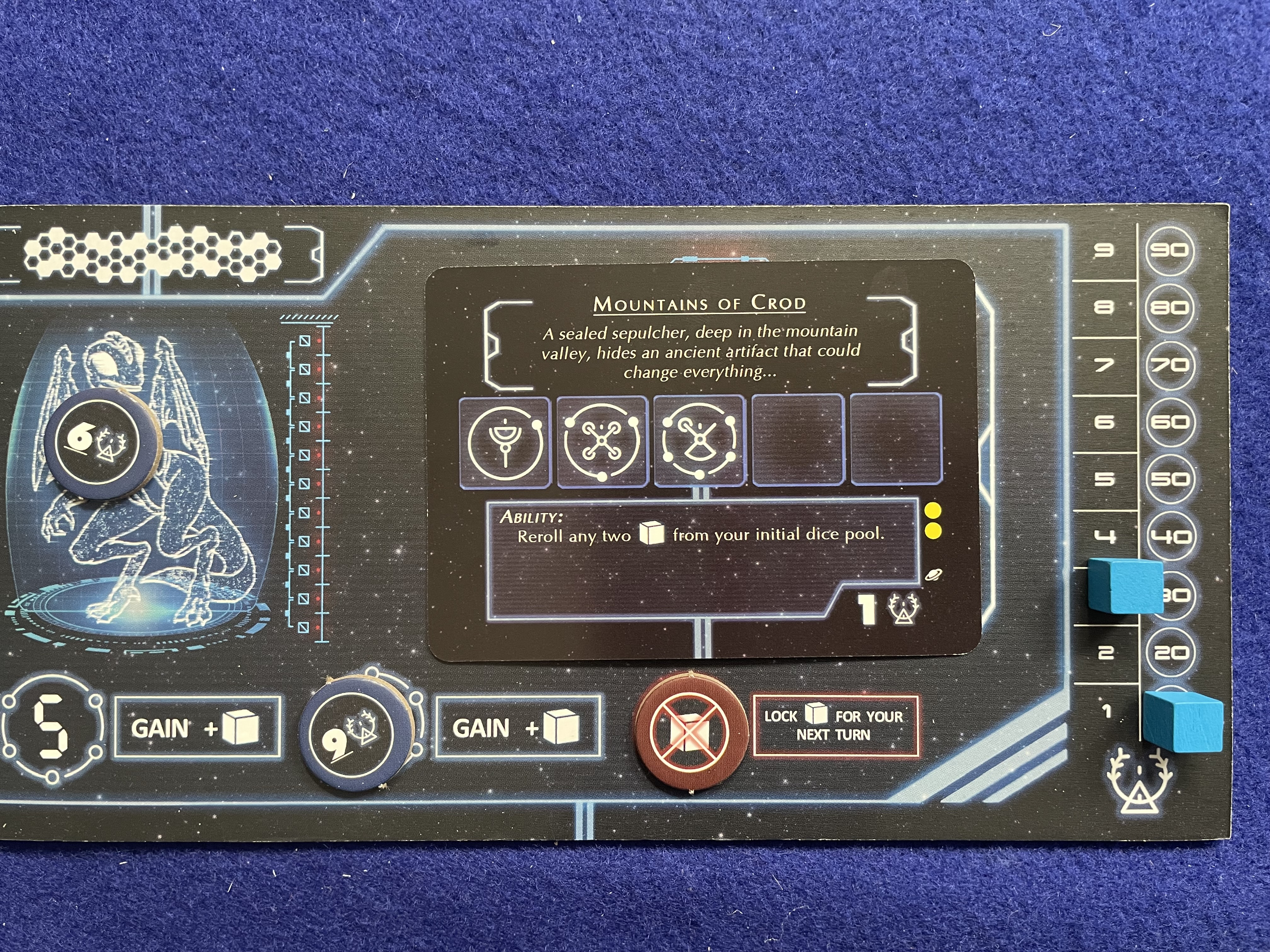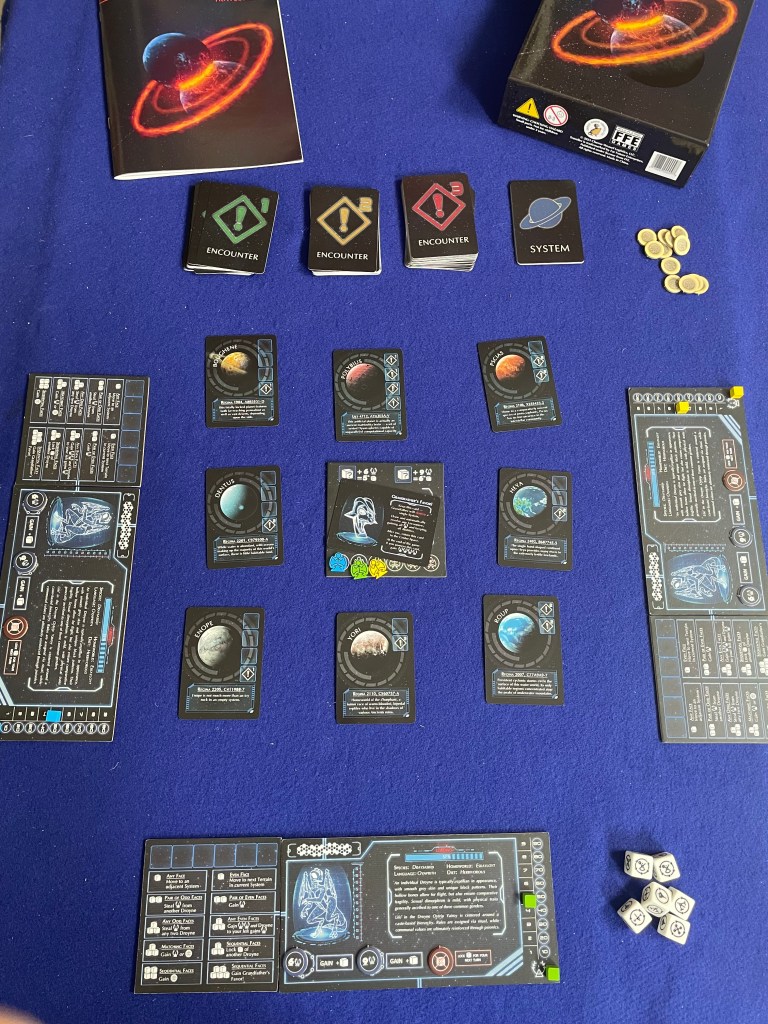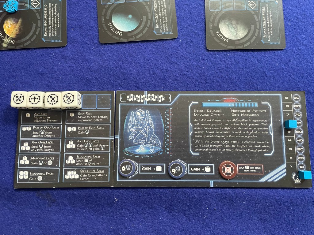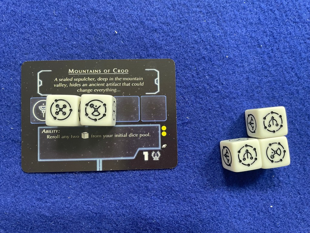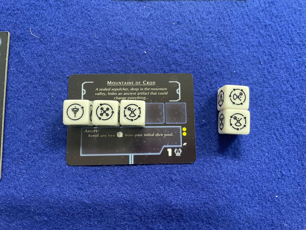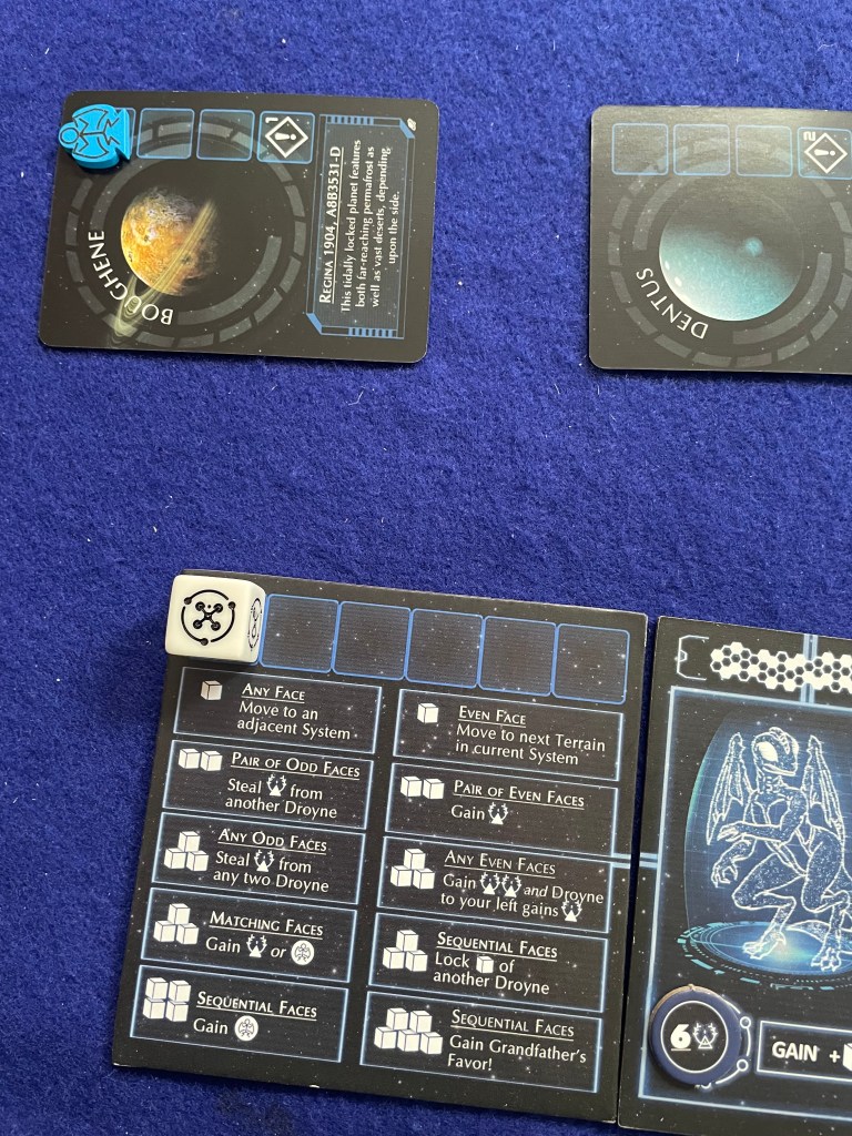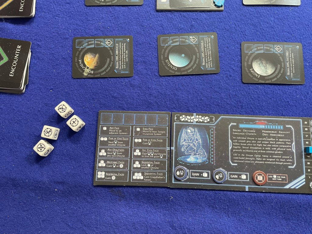 The goal of To Honor Grandfather is to take your “Tyafelm”—literally your pool of caste dice—and explore planets while gaining (or losing) Honor and Croyn (coins) along the way. [In a clever bit of theming components each side of the dice in To Honor Grandfather is a caste of Droyne; conveniently there are six castes for each side of a six-sided die.] On those planets the players will face Encounters that will require rolling their Tyafelm (i.e. pool of dice) to match faces and complete the challenge. Once all the Encounters on a planet are complete the planet is removed from play and another one placed on the table. The game ends when the last planet (total number based on player count) is explored with the winner being the player with the most Honor.