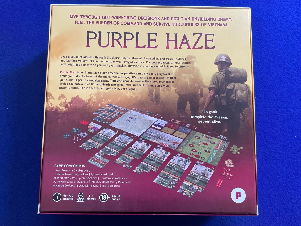 That is a near-quote from the Design Notes for Purple Haze by Bernard Grzybowski from PHALANX which was published in 2024. The game is self-described as a story-creation, tactical combat wargame. It is also cooperative where the players are part of a Squad in Vietnam sent on missions facing off against three E’s—Events, Encounters, and Enemies—all driven by the rules and not an opposing player.