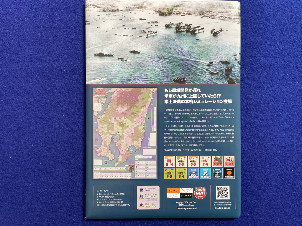I look forward to getting this Bonsai Games folio edition of Assault on Japan Ancestral: Kyushu 1945 to my gaming table. That is, of course, after I translate the rulebook (pdf in Japanese online) and Player Aids. Fortunately, Generative AI tools are very helpful in translation. Sure, it takes some extra effort on my part to prepare to play but my past experiences with Bonsai Games folios that repackage previous non-Japanese designs (like NORAD) has been very positive so there certainly is motivation on my part to do the prep work.