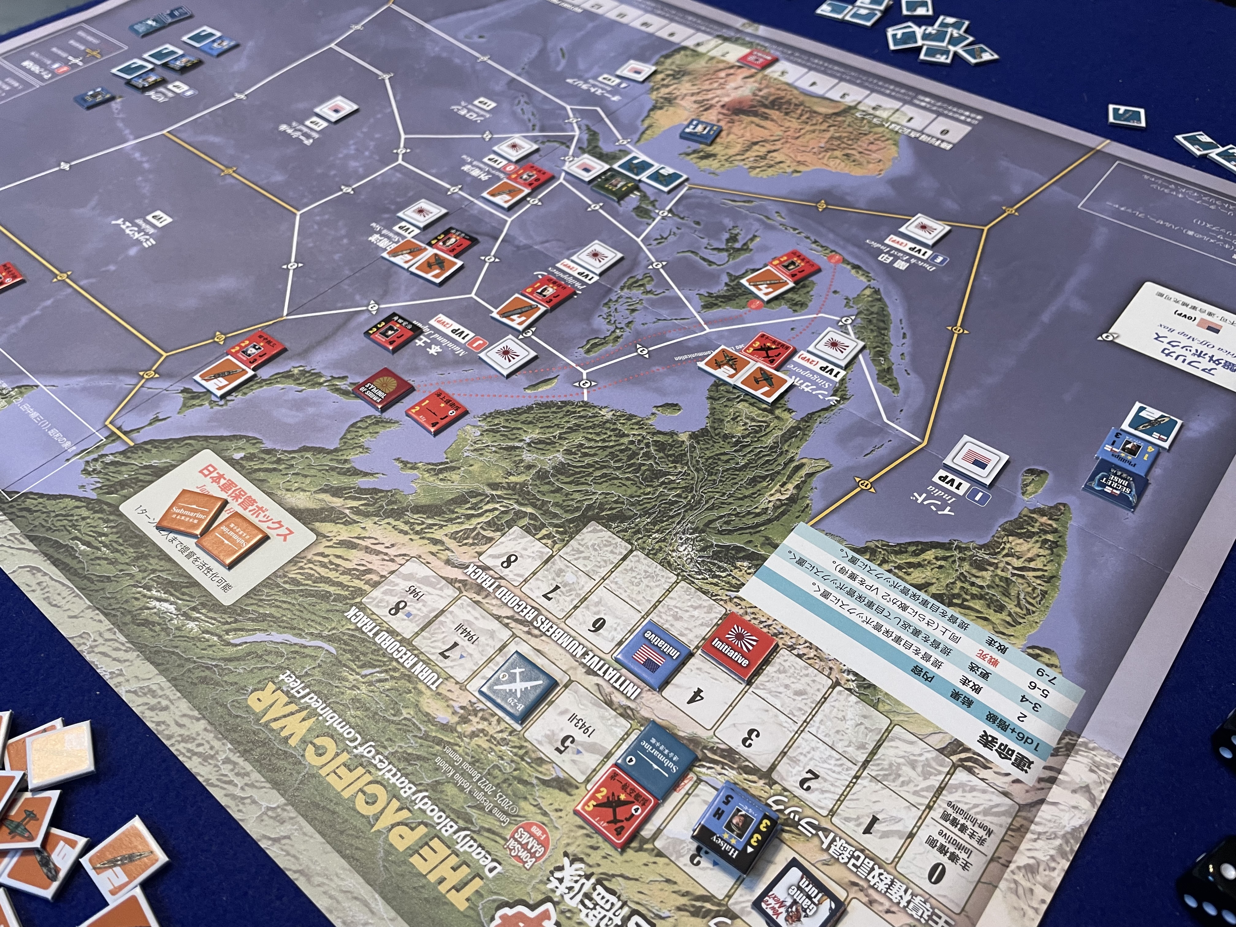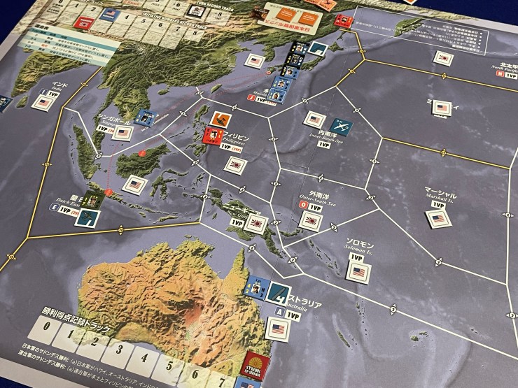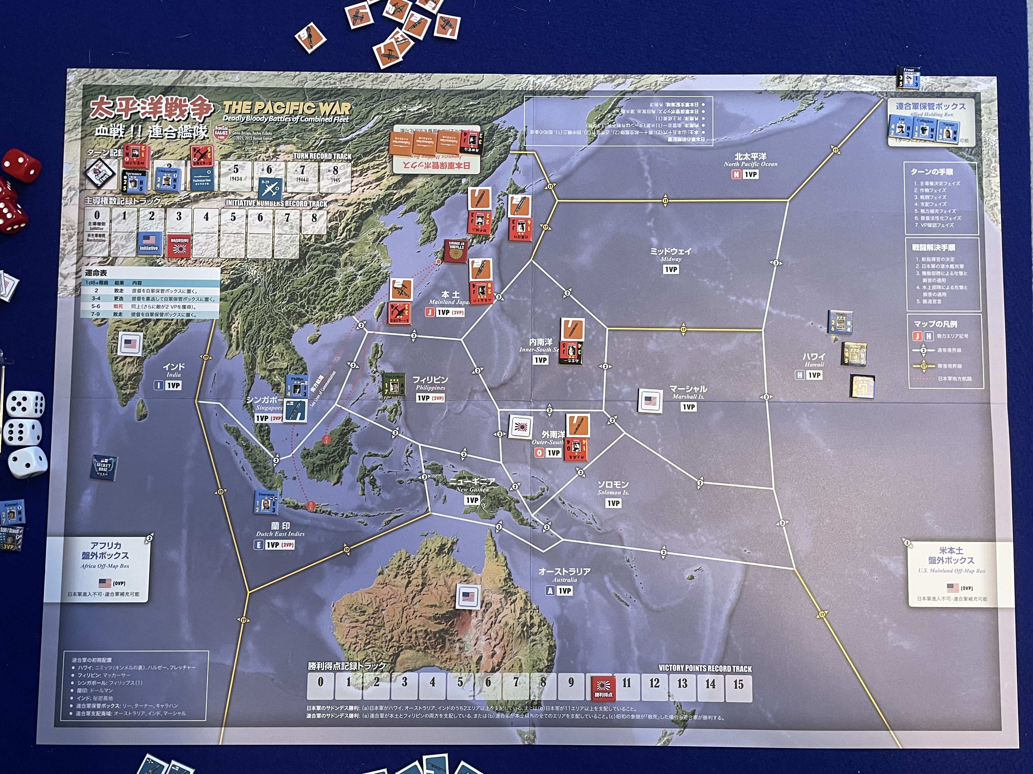 Apologies, I got so into playing The Pacific War that I rushed the photos of these turns and they turned out unusable from glare. Suffice it to say the Allies used a “Central Thrust” strategy where they built up carrier forces driving through the Marshall Islands into the Inner South Sea. The Japanese kept Yamamoto in the Dutch East Indies which froze MacArthur in Australia and Phillips in India. The problem, however, turned out to be the ability of Japan to reinforce the admirals pushed back into the Home Islands; without Yamamoto the rate of reinforcement was too slow to build up a strong response to the Allies. [In the Reinforcement Phase, the maximum number of reinforcements into a area cannot exceed the rank of the highest admiral; if the C-in-C is in their home area they can also ‘lend’ their reinforcements to other admirals as long as a supply chain of controlled areas connects them.] The Allies actually attacked the Home Islands in Early 1944 and took control. Fortunately for the Japanese, the Symbol of Showa escaped and without concurrently taking the Philippines the Allies did not meet their Sudden Death Victory Conditions…for the moment.