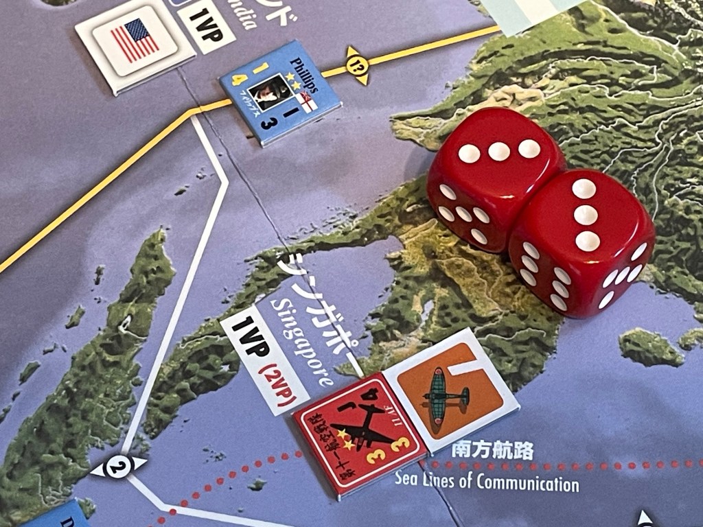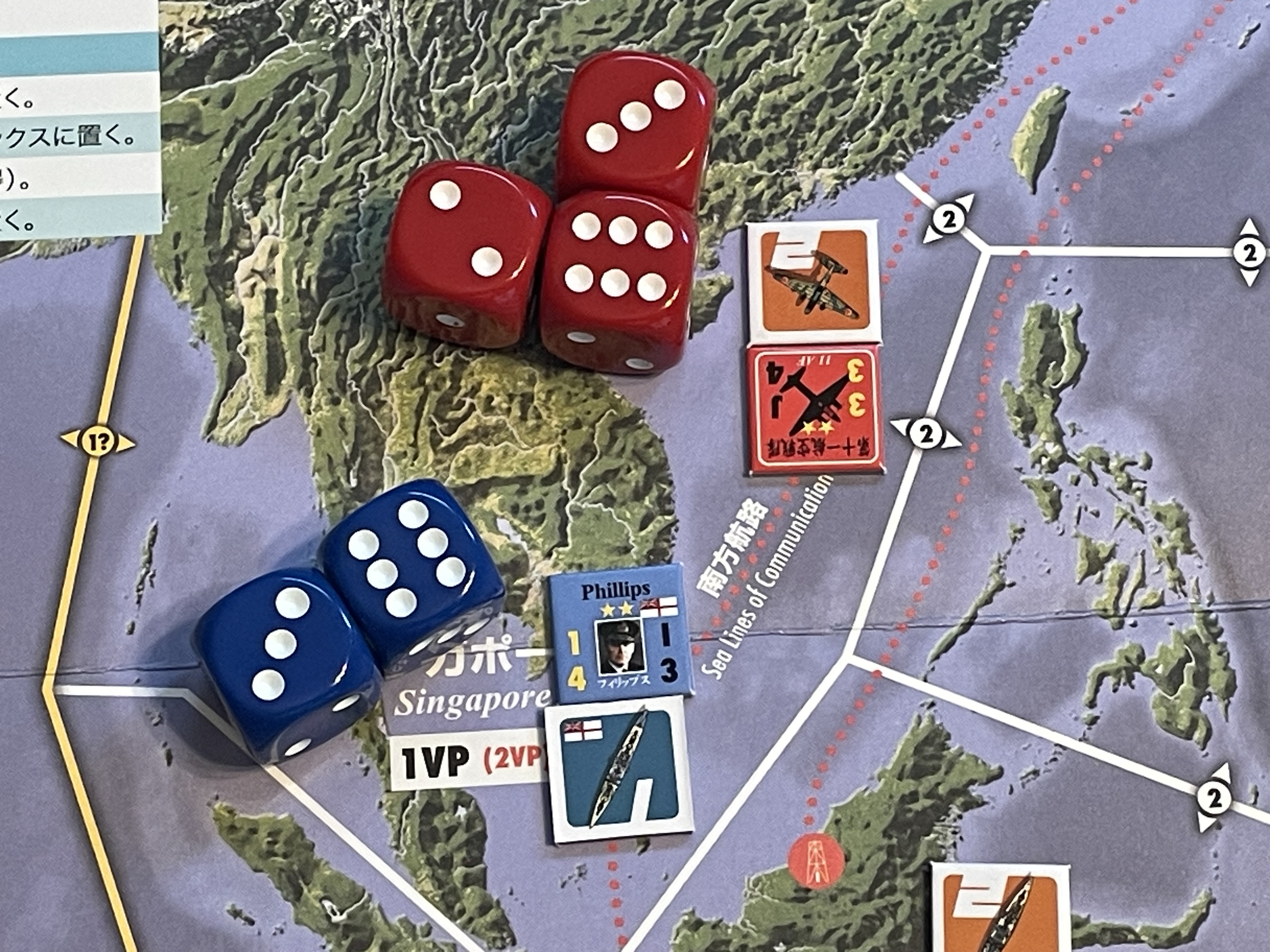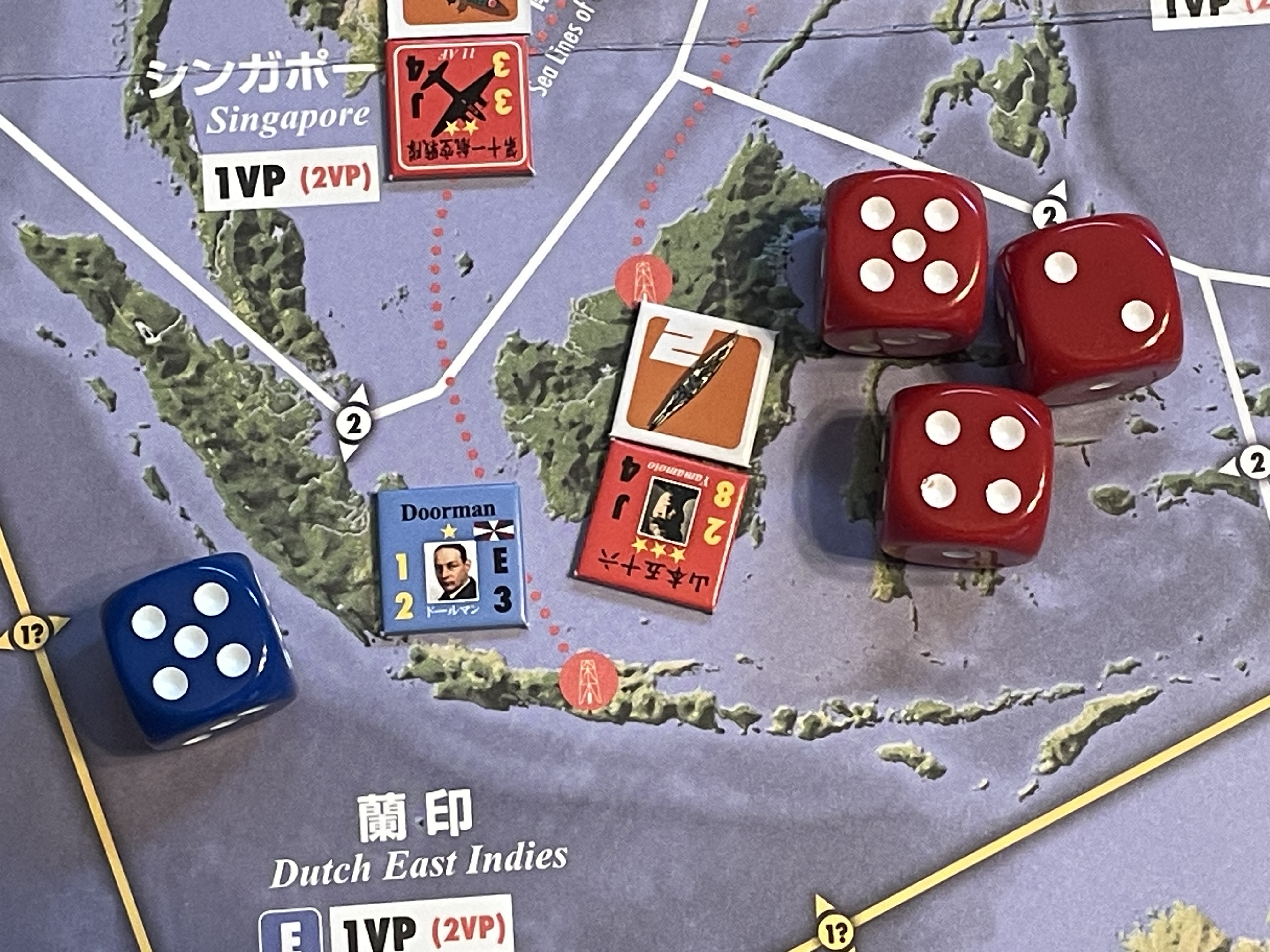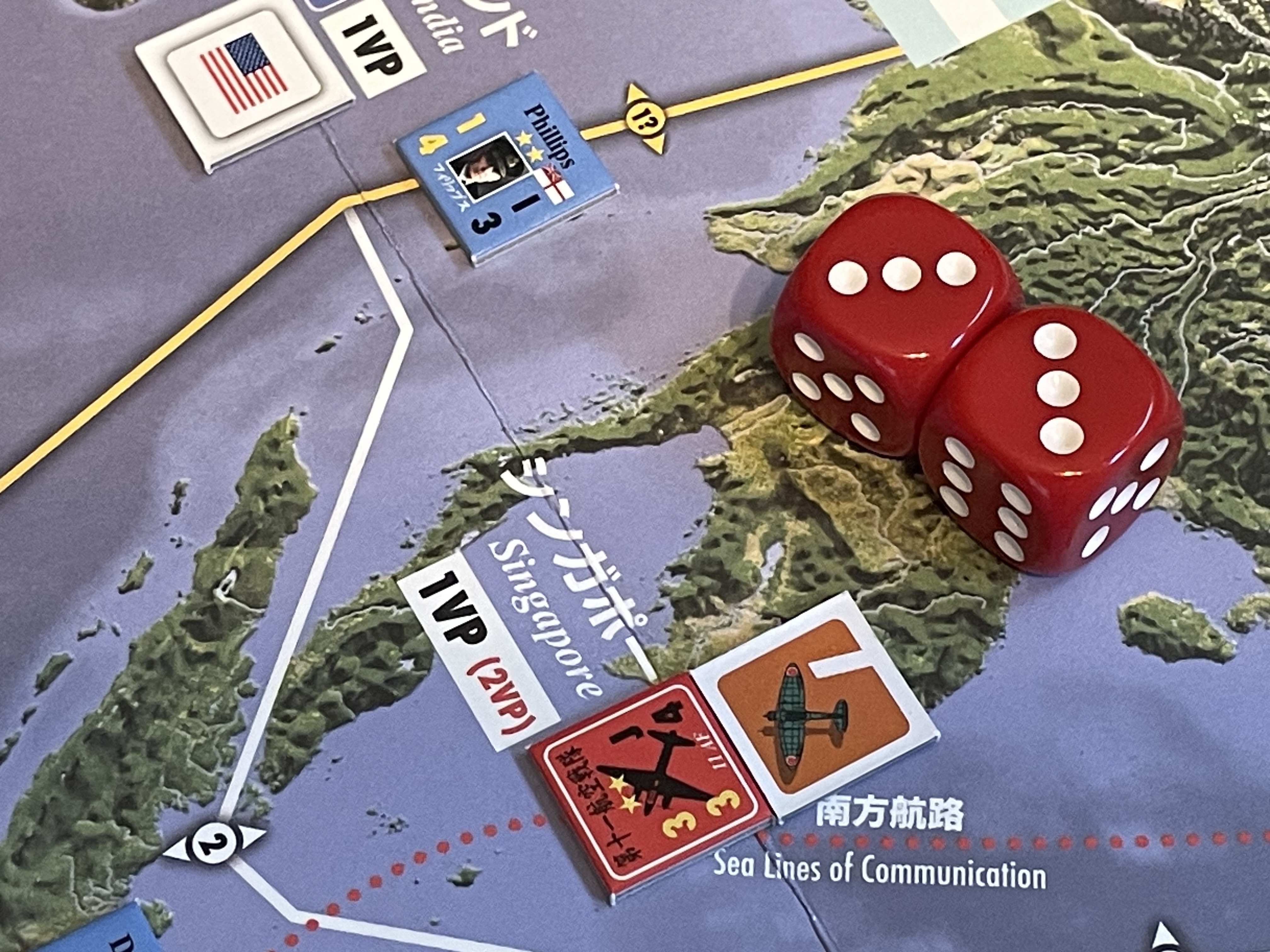 The first battle of the Combat Phase took place in the waters off Singapore pitting the 11th Air Fleet (11AF) against Force Z led by Phillips. In the first round of combat—shown on the left above—the Japanese roll 3d6 (total of # of admirals + Strength) where each roll of 4 or greater hits (the difference in Tactical Acumen is 11AF Tactical = 3, Phillips Tactical =1; more on this DRM later). The Japanese score a single hit from the [6]. Phillips rolls 2d6 (unmodified) for a single hit. Wanting to avoid death, Phillips retreats and though the Japanese get a free attack with 2d6—shown on the left above—the British admiral escapes to India.