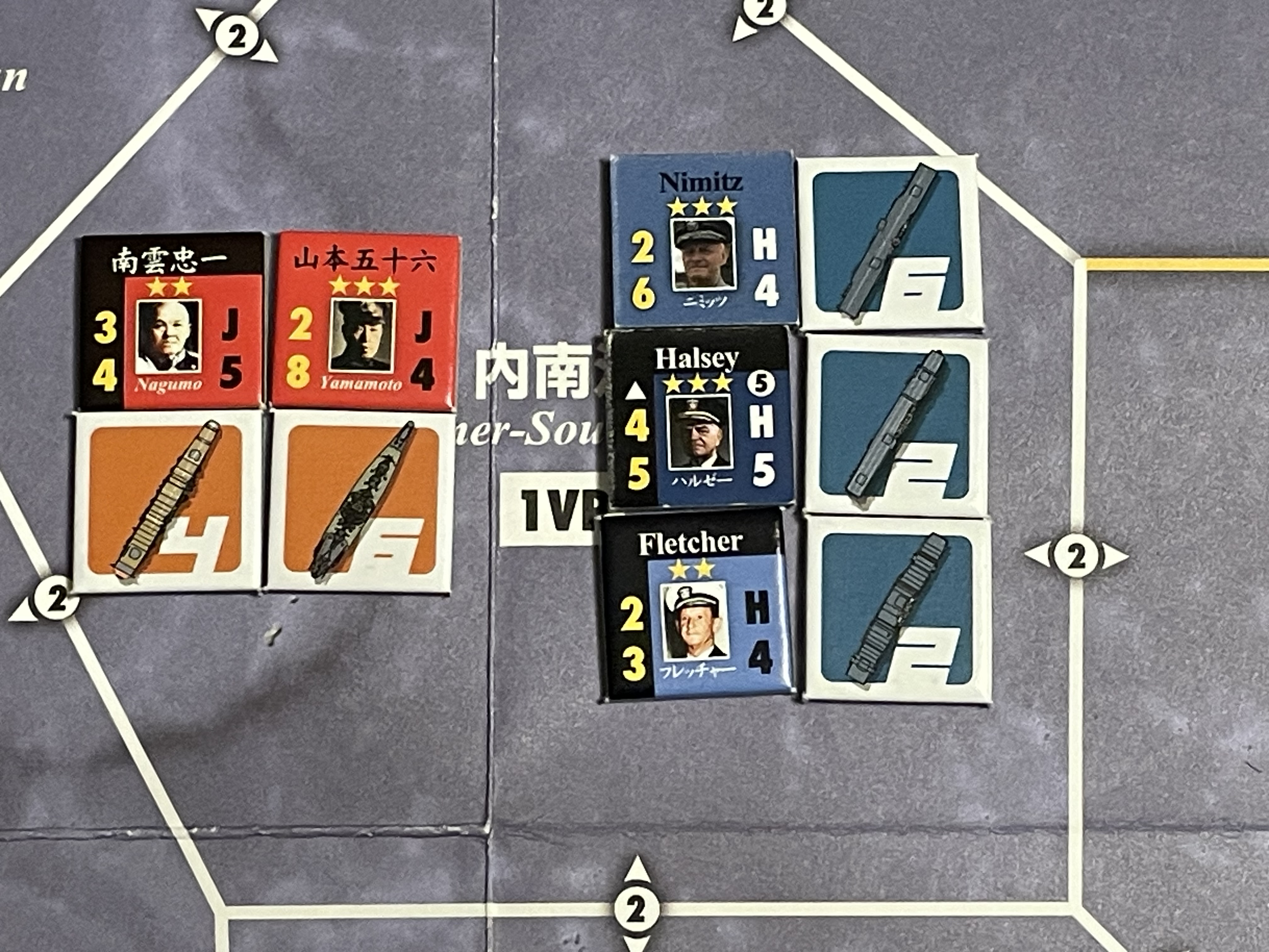 If Yamamoto is chosen as Overall Commander for the Japanese the initial combat round will roll 8d6 for the Japanese as Yamamoto’s Command Rating (8) is LESS than the sum of two admirals plus 10 Strength Points. If the Americans chose Nimitz as the Overall Commander they roll 6d6 as his Command rating of 6 is also less than 3 admirals + 10 Strength Points. The rolls for both sides are unmodified as both have Tactical Acumen 2. Simple odds tell you that Yamamoto likely have the advantage given average rolls with two additional dice. But what if Halsey was the Allied Overall Commander in this battle? The Americans would only roll 5d6 (Halsey’s Command Ability) but each roll would have a +2 DRM since Halsey’s Tactical Acumen is 4 or +2 over Yamamoto. That changes the chances of a hit from 1-in-6 to 1-in-2. Even rolling three less dice are those odds worth the risk?