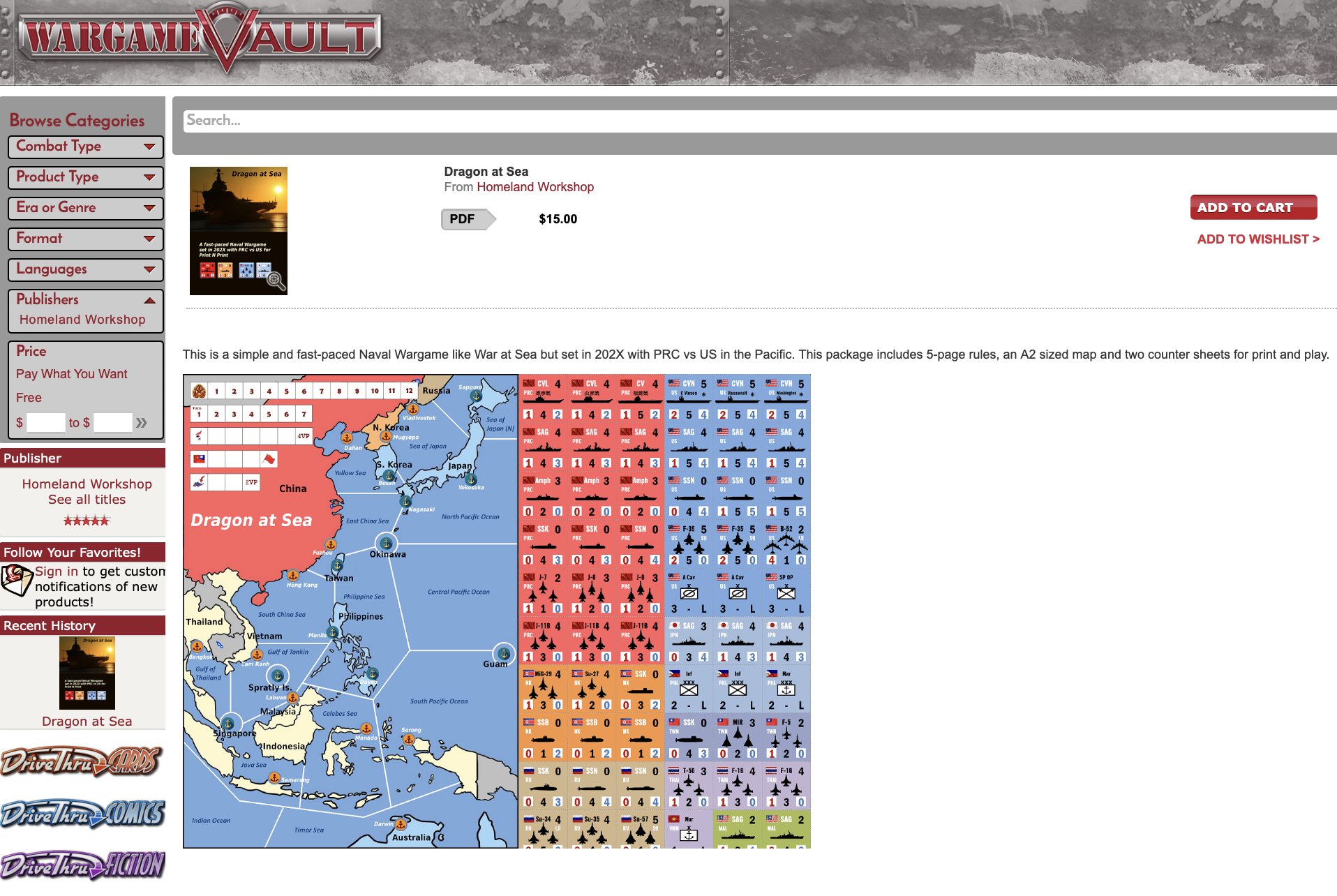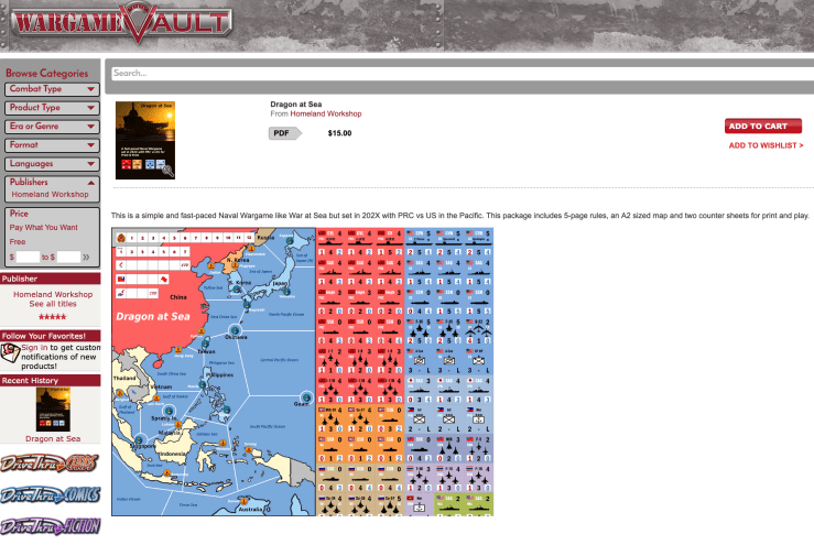 Available on WargameVault is a Print-n-Play (PnP) title called Dragon At Sea. Designed by David Cheng, the game touts itself as, “An exciting naval wargame about China vs US in the Pacific in 202X.” The description of BoardGameGeek relates, “Game map is area based like the classic game War at Sea. Game map is A2 size. The game has 352 counters.” The title sells for $15. Given the topic I jumped at the chance to explore this game. That is a decision that I now…regret.