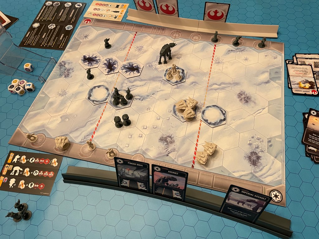 Remarks. Imperial patrol led by Colonel code name “RMN T.” Rebel forces fixated on Snowspeeder attacks on AT-AT which statistically is low-payoff (every hit must be confirmed which only has a ~6% chance of happening). Poor Command Cards for Rebels left one Snowspeeder flight unengaged until mid-late game. RMN T made good use of terrain for protection and Command Card opportunities such as “Pressing Forward” (Order 2 units; cannot attack but move up to 2 additional hexes) to rapidly reposition AT-AT. A close run battle that literally came down to one last move by each side with the fate of the dice determining the final winner.