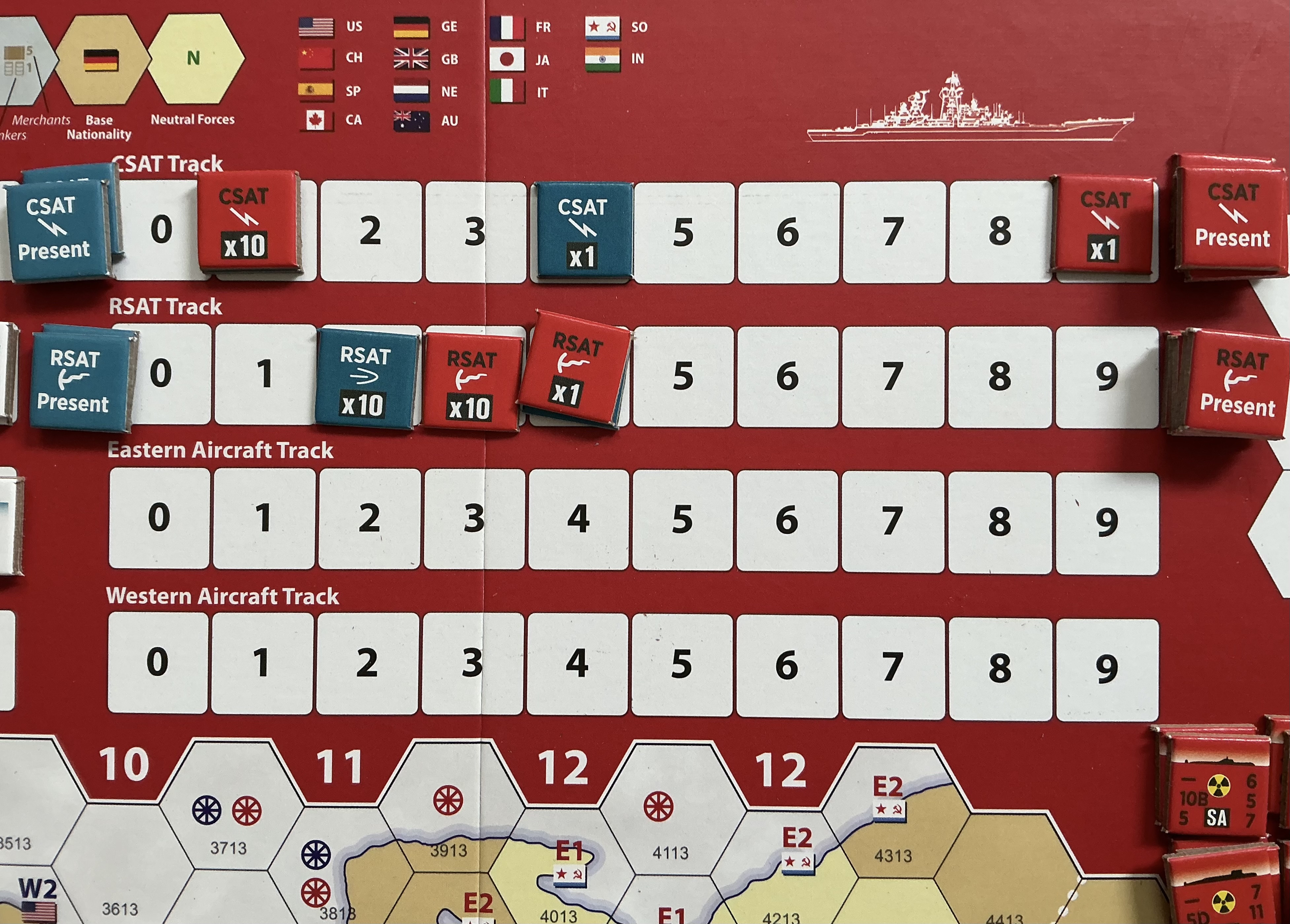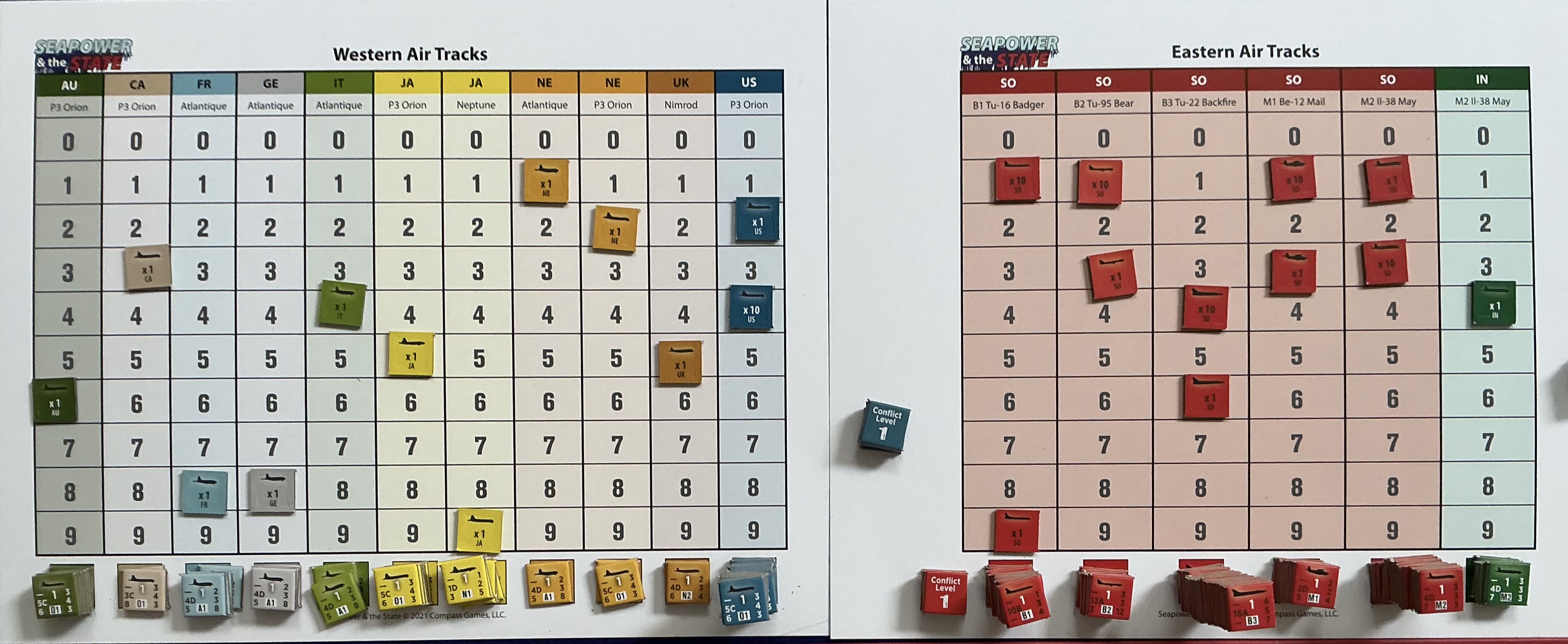 Both players in Seapower & The State use their individual Air Tracks player aid to keep track of the number of aircraft available to them. The Air Tracks player aid is an upgrade in the 2025 edition; in the 1982 edition each player had a single Air Track for each player on the map that was crowded with the many aircraft tally markers. [The 2025 edition retains those tracks on the map; I’ve heard of “faithful reproductions” but why?]