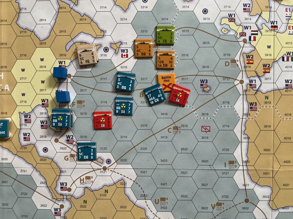 A neutral nation that has not entered the conflict but has target hexes still has these hexes counted as targets. Target hexes containing Western bases that were captured during the game cease to be considered target hexes for either player. Target hexes containing Western bases that have become inoperative due to interdiction remain as targets for the Eastern player. After totaling points earned by each player for SB units in range, each player must subtract from their total 10 points for each opposing target hex that did not have at least one SB type units in range to attack that target (regardless of the BM range of the SB unit). In addition 1 point is subtracted for each SB unit that was in range to attack but not within 14 hexes of a friendly CSAT [Communications Satellite] present marker.