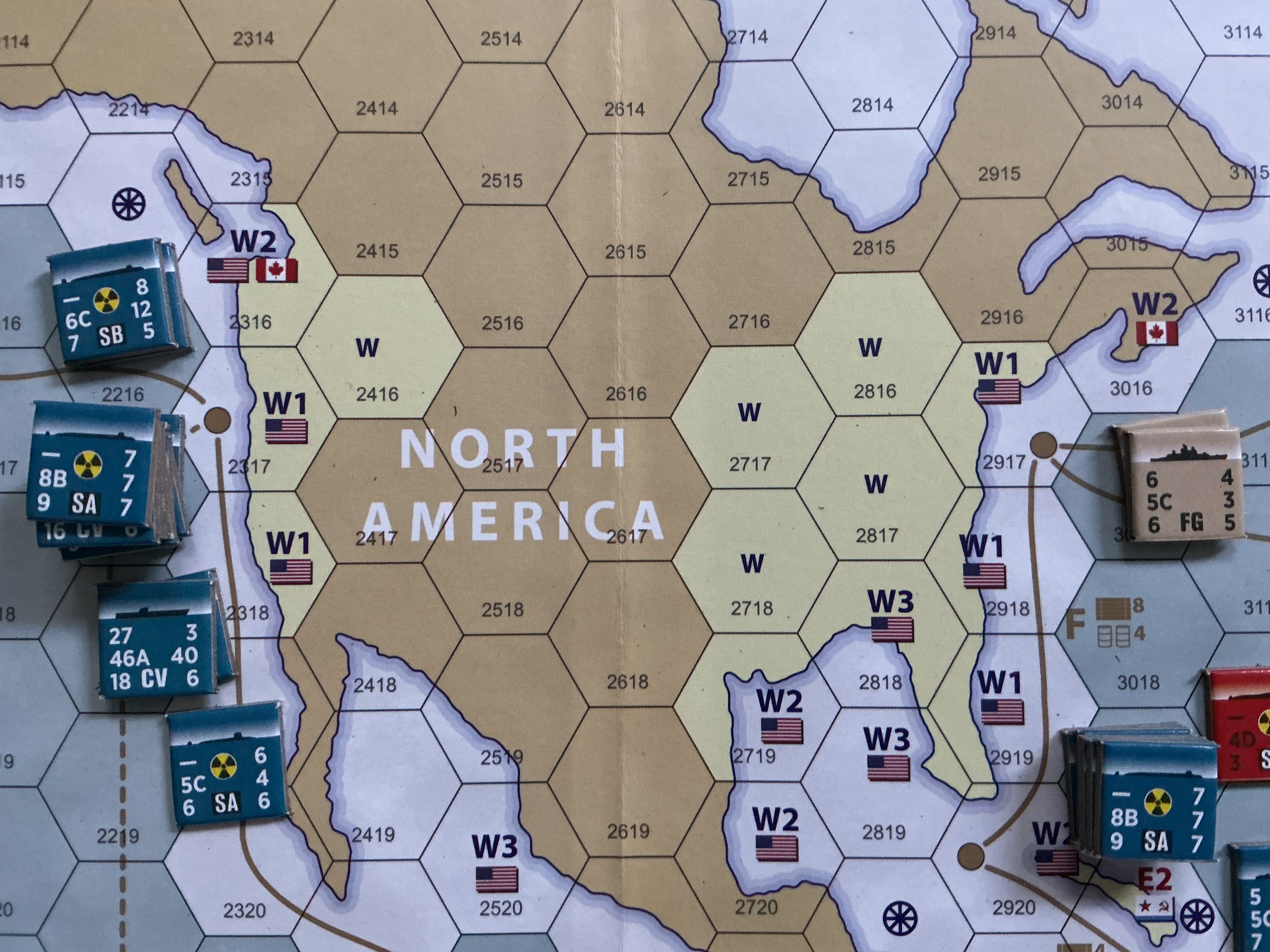 As with tracking aircraft and shipping losses in Seapower & The State, keeping track of target hexes cries out for a player aid. A more relevant question, however, is asking what is the point of Level 5 Conflict in the game. Does counting Victory Points really mean anything in a (game) world that has glowing landscaping and mushroom clouds across the horizon? I wonder if Newberg was channeling thoughts generated by another nuclear conflict wargame for I am reminded of the Designer’s Notes in Ultimatum: A Game of Nuclear Confrontation by J. Michael Hemphill from Yaquinto Publications in 1979: