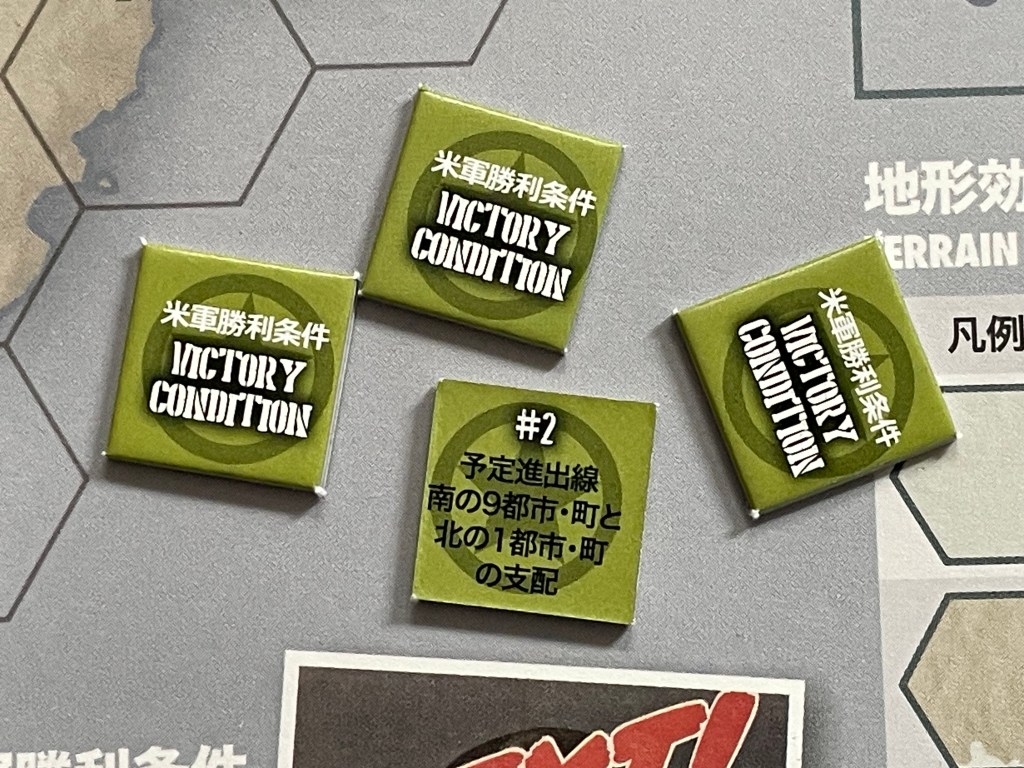 The American victory condition is shown on a chit that is kept secret (face down) from the Japanese player and revealed at the end of the game. The American player wins a Major Victory if they reach their victory condition at least one turn before the end of the game. If the American player reaches their victory condition on the last turn it is a Minor Victory.