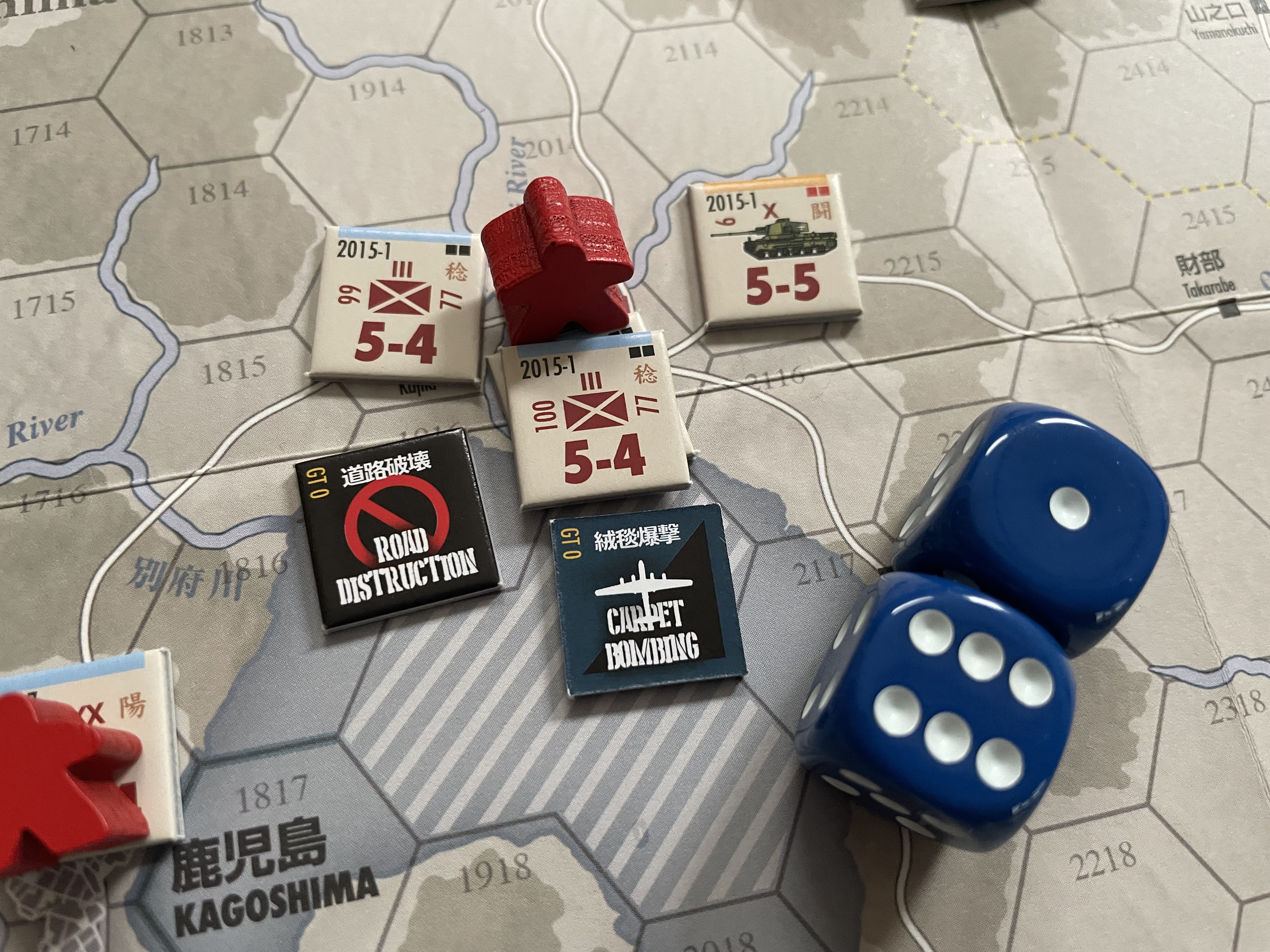 Upon setup of Kyüshü 1945 the village of Kokubu (hex 2015) is occupied by two brigades of the Japanese 77th Infantry Division. It also is a crossroads on the only real east-west road connection across Kyüshü that lies south of the Final Line of Advance. The village and the units in it were hit both by Carpet Bombing (one brigade with no damage and the second with 2-step losses and eliminated) and a Road Interdiction (marker placed). The second American Road Interdiction was placed in the town of Kobayashi (hex 2512). [Choosing placement of the Road Interdiction markers was tougher than I thought as I realized that the American player likely will also need those roads. Once interdicted, however, the hex is interdicted for both sides for the entire game.]