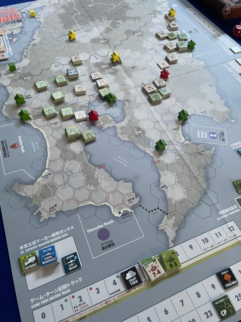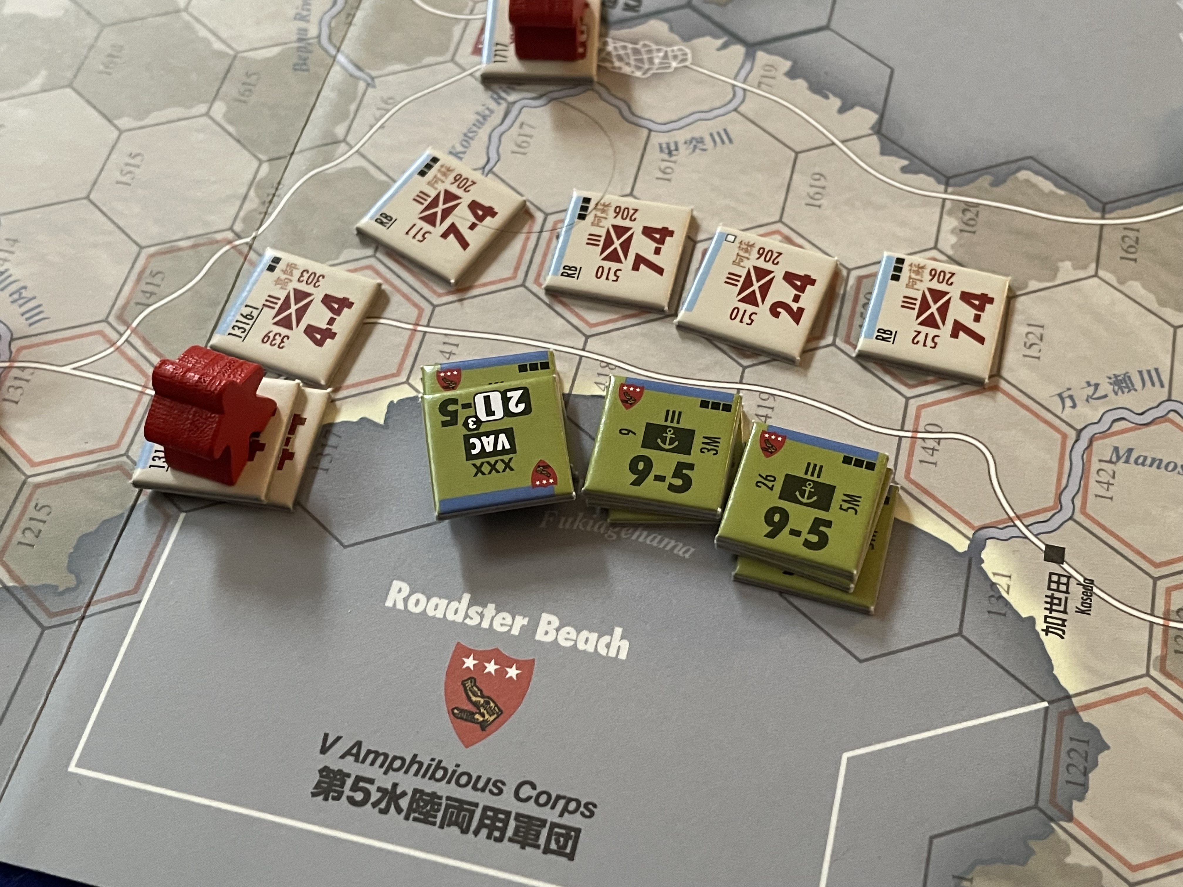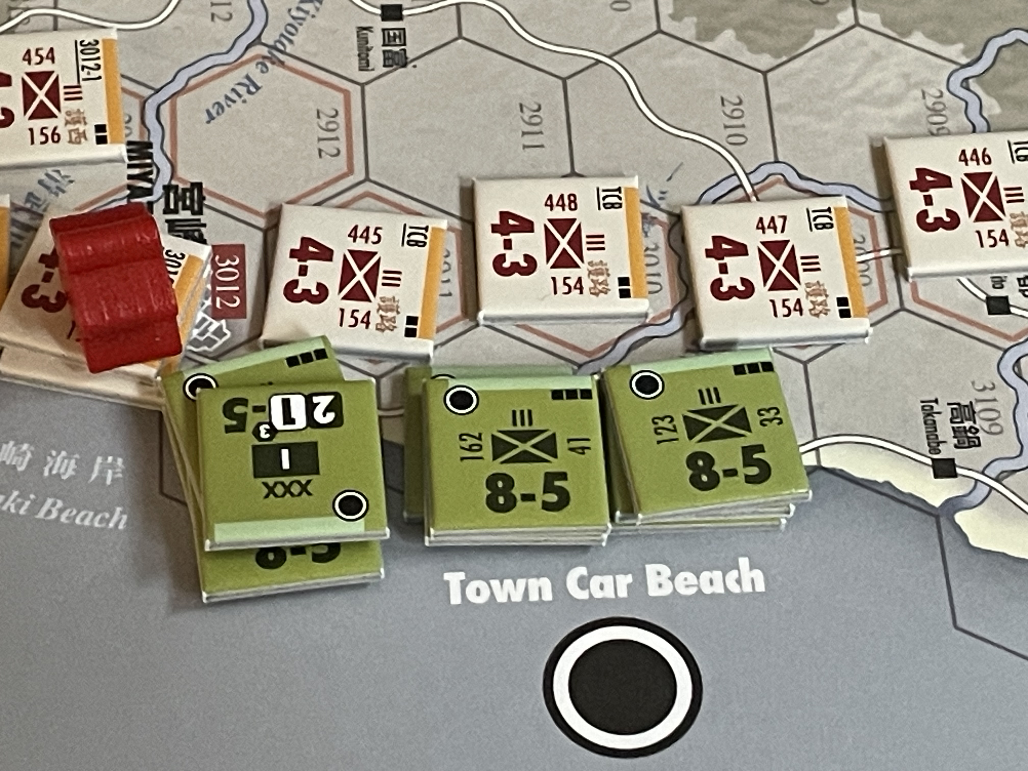 The Japanese attack is followed by a second assault wave by XI Corps against Limousine Beach; this unopposed landing suffers no step losses. After the Japanese gain but two steps of reinforcements the American player takes to the offensive and pushes the Japanese off their fortifications facing Roadster Beach (V Corps) in the west and Station Wagon Beach (XI Corps) to the southeast. At Town Car Beach (I Corps) the Americans (barely) push off the beach in the face of strong Japanese resistance.