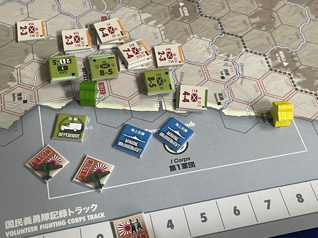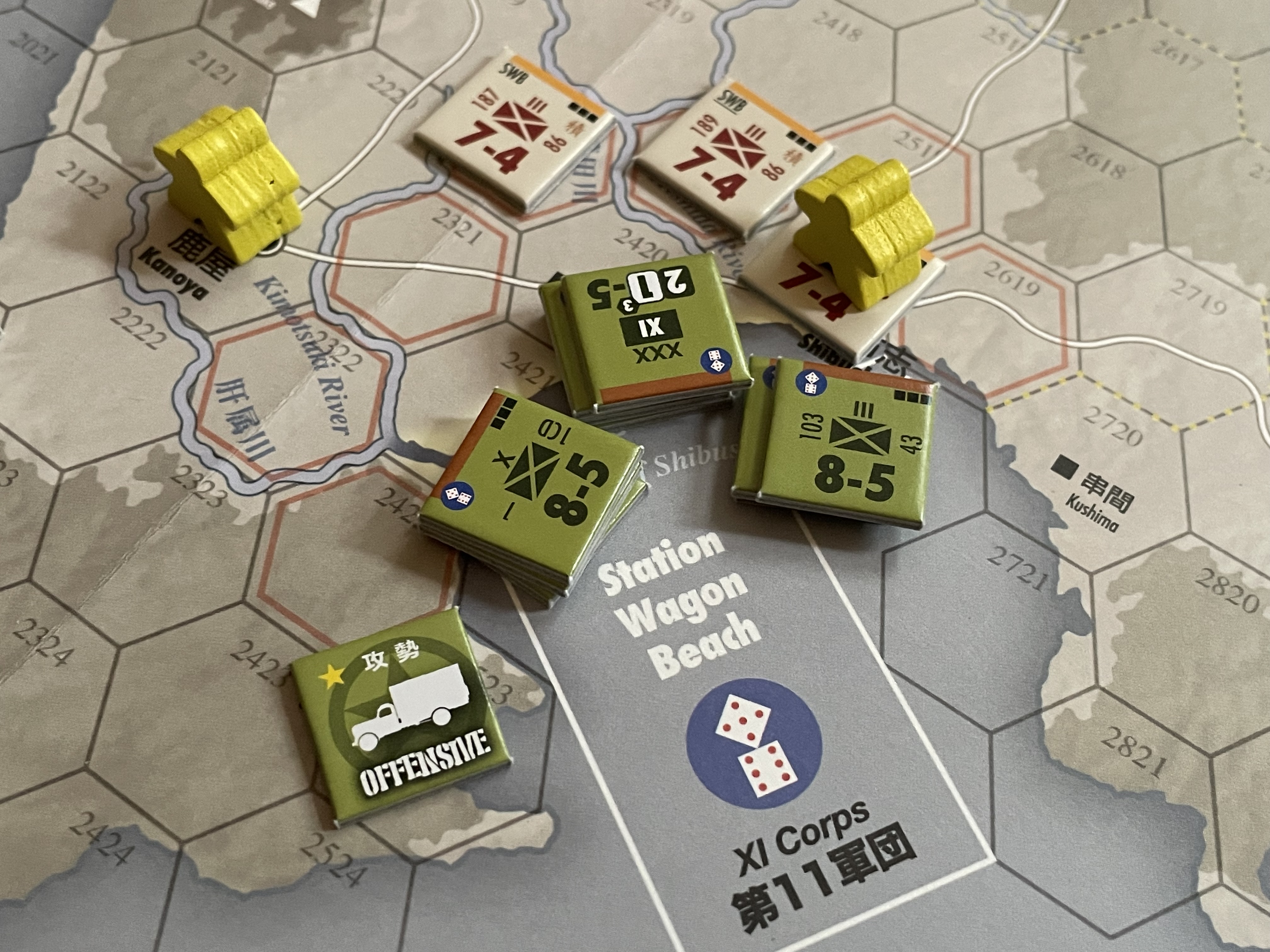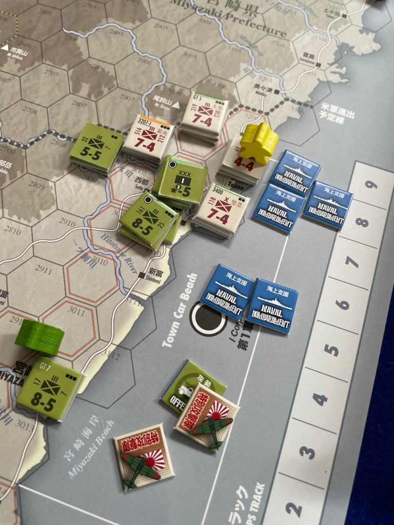 - IX Corps (Station Wagon Beach) – The Americal and 1st Cavalry divisions went ashore unopposed yet 186/Americal lost a step. The landing of the 43rd Infantry Division into Shibushi (hex 2520) was opposed by the 198/86th Infantry. The bloody combat on the beach saw Americans lose two steps and the Japanese one step and withdraw.