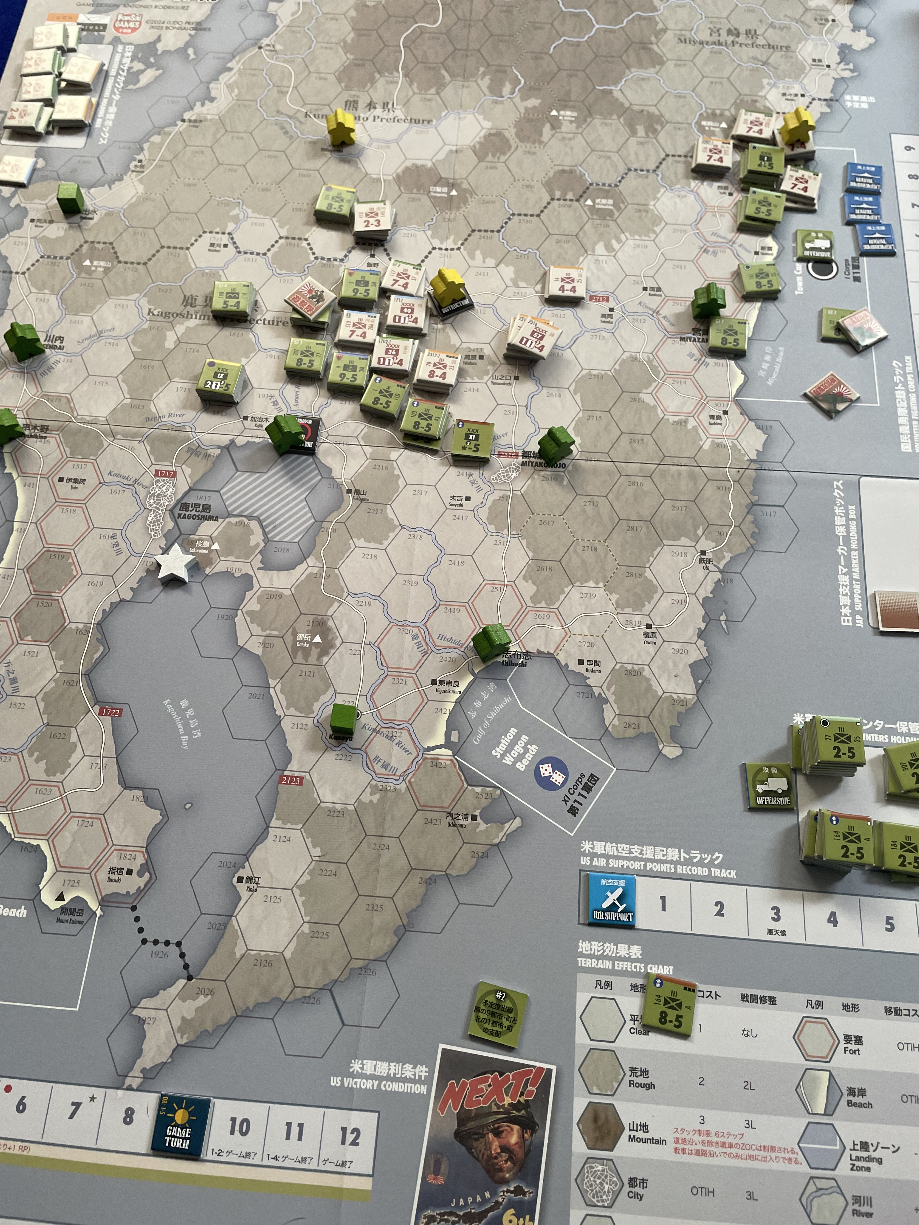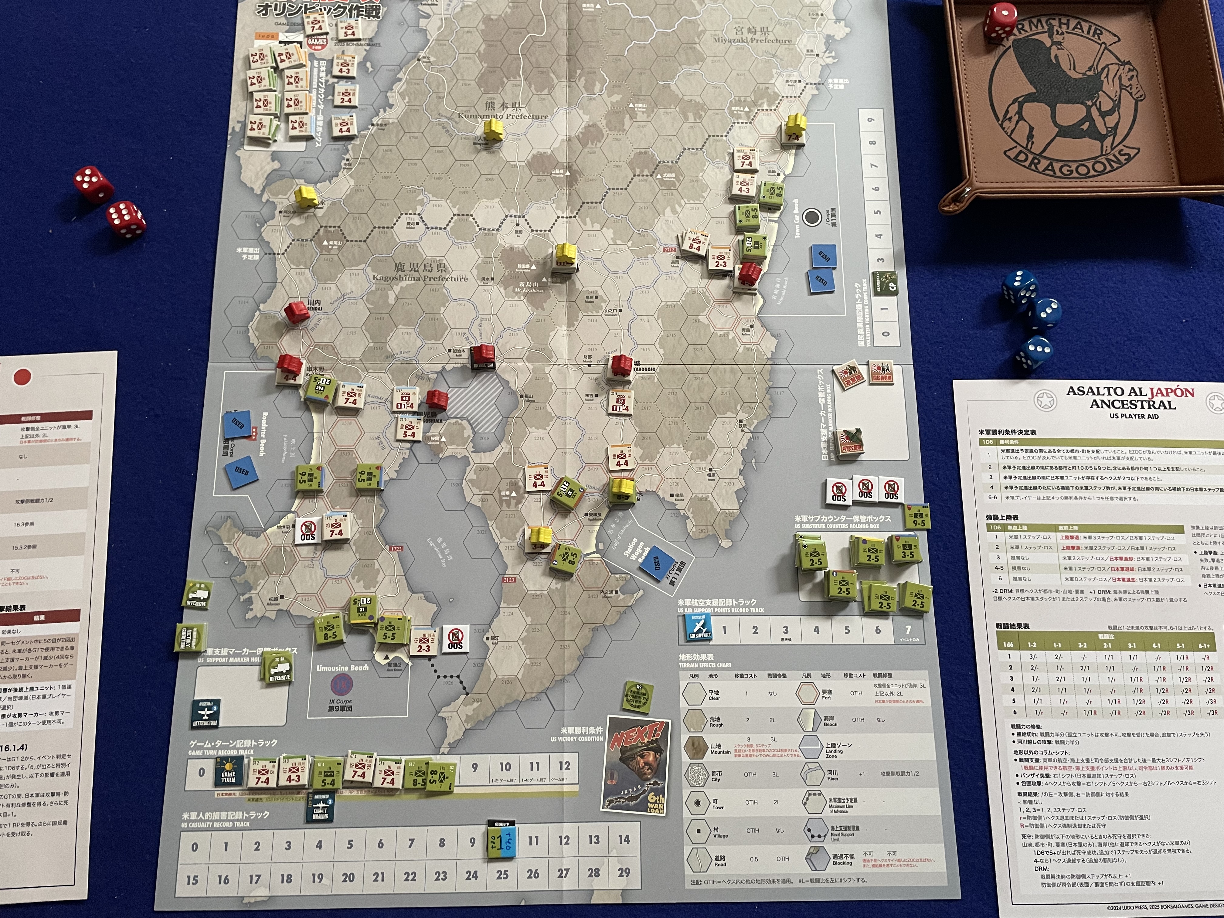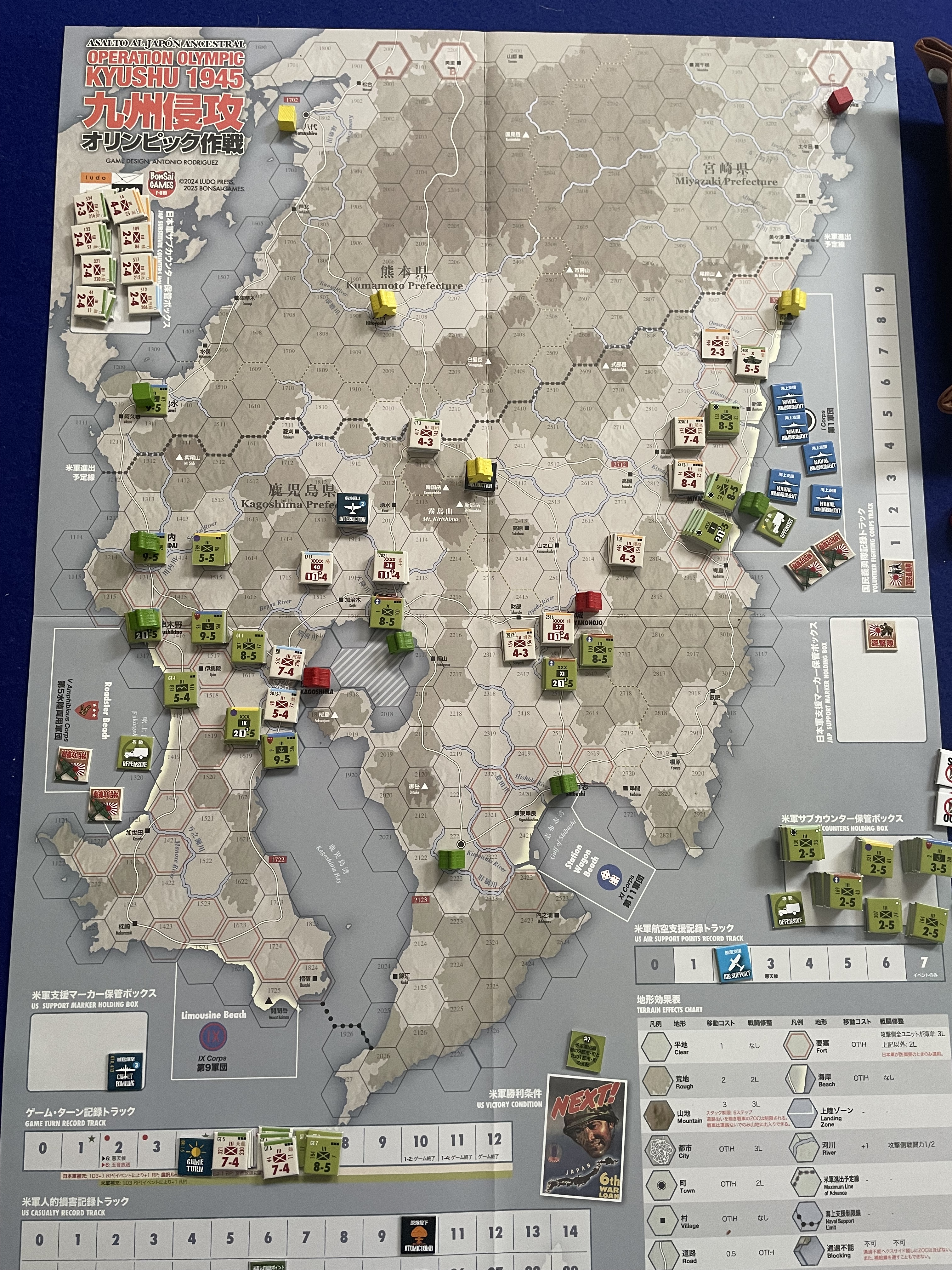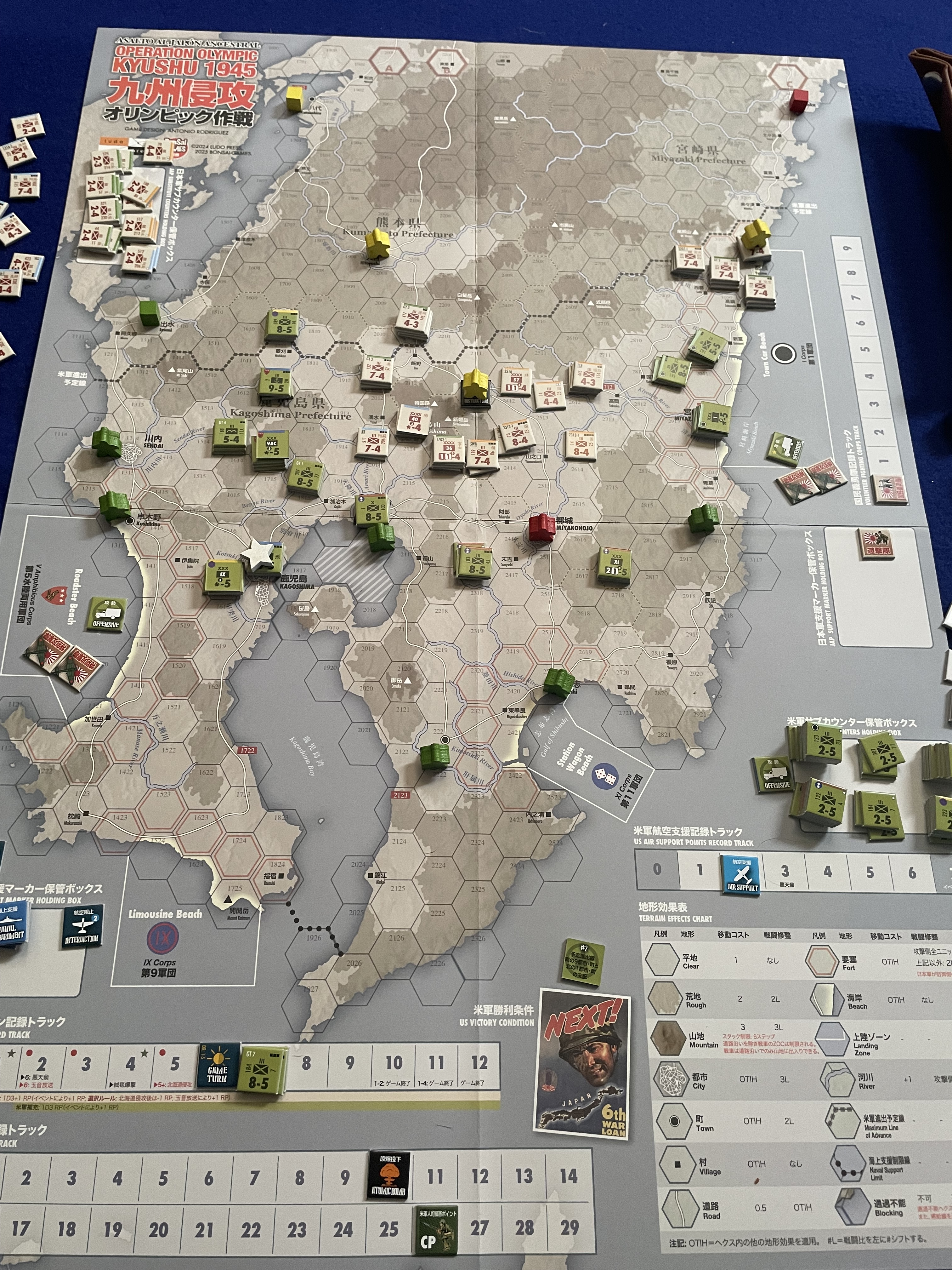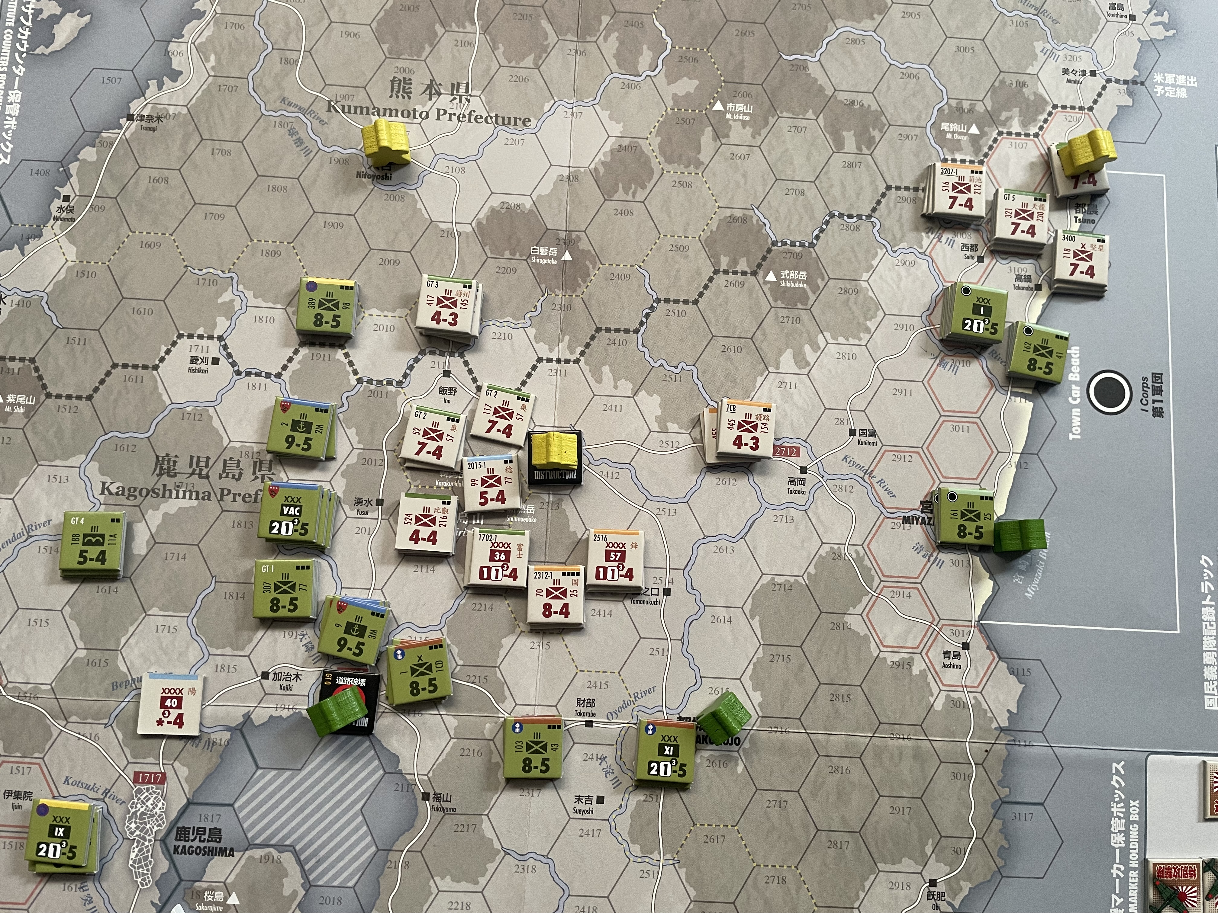 In my first game of Kyüshü 1945 I drew the #2 Victory Condition (hold at least nine (9) of the ten (10) Cities and Towns south of the Maximum Line of Advance and hold one or more of the four City and Towns north of the Maximum Line of Advance) for the Americans. I decided that the Japanese strategy was to defend the beaches from fortifications and aggressively once the Americans were ashore.