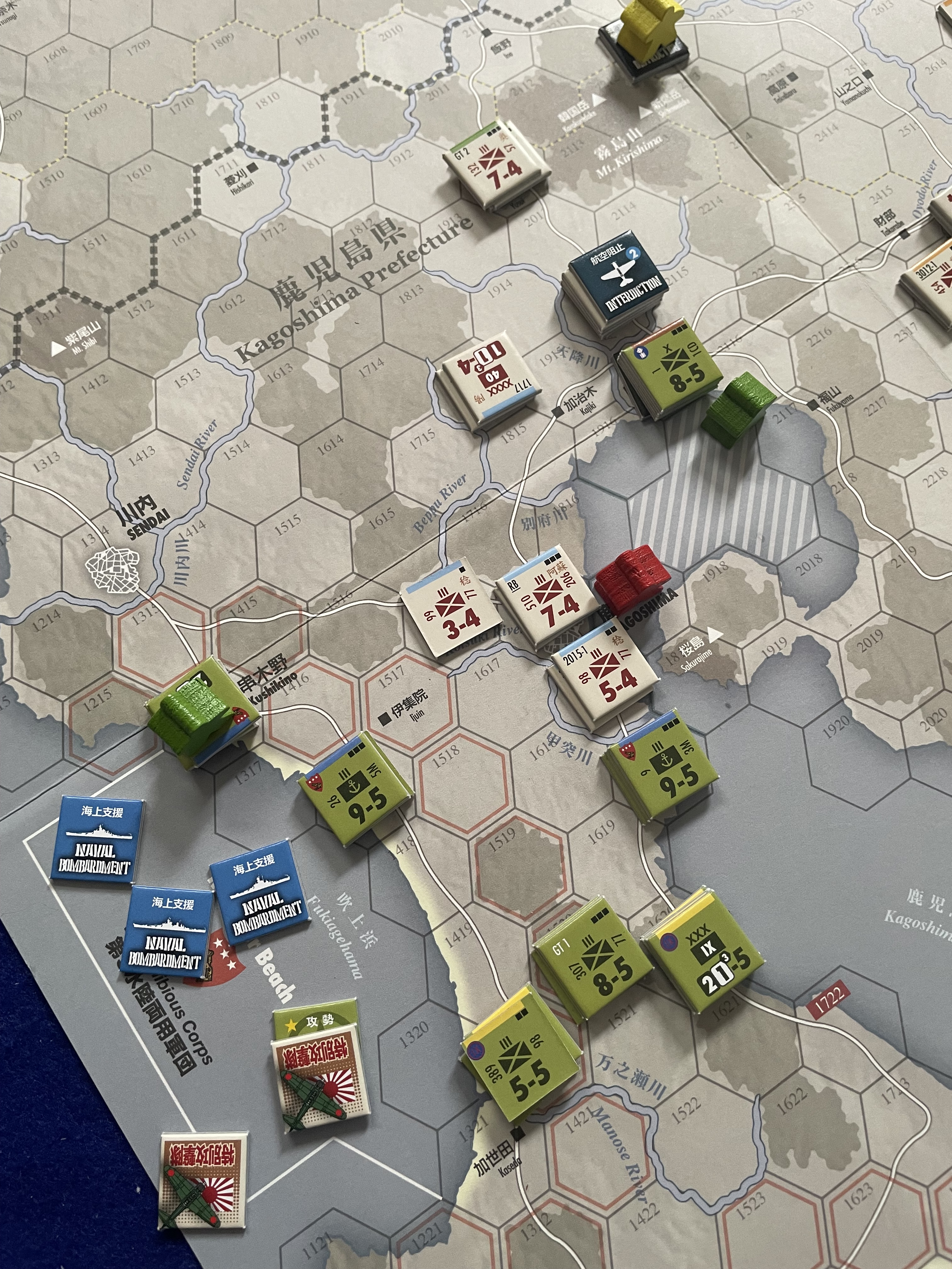 The first turn of Kyüshü 1945 is almost exclusively dedicated to two waves of landings. When American divisions land they do so against opposition (enemy on the beach) or unopposed. Either way the division headquaters is always “spent” (i.e. unable to lend Support) and there is a chance the American units will lose steps. Here is how the first wave of landings developed: