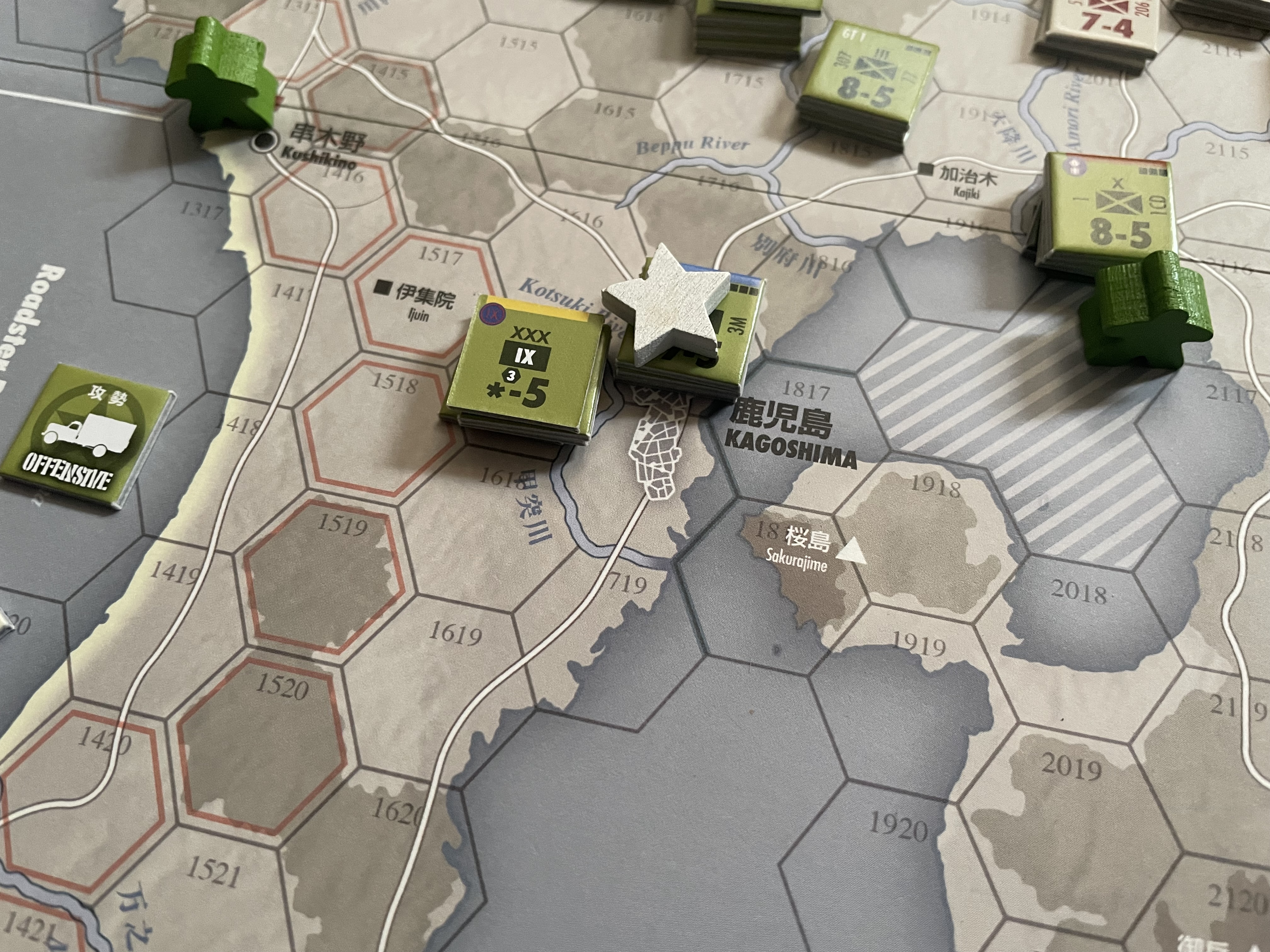 Turn 9 of Kyüshü 1945 sees the return of good weather meaning the 7th Infantry Division will arrive in an administrative landing. Unfortunately, the Soviets enter the war (Optional Rule 16.1.2) which takes away half of the Japanese “Tokko” attacks. In the Events Phase, the Japanese get “Guerrillas” which they place on V Corps Headquarters and the Americans roll “Sabotage” which allows the Japanese to expend XI Corps Headquarters—any American offensive this turn will be limited. In a change of tactics, the Japanese “Tokko” attacks go after the arriving 7th Infantry and prevent an entire Regiment (3 Strength Points = 3 Casualty Points) from coming ashore. In the combat phases, the Americans cross the Omaru River but at cost, a Japanese Banzai attack pushes back the IX Corps Headquarters, and lower-odds attacks by the Americans wear away the Japanese who nonetheless hold a strong position around Mount Kirishima. American casualties trend significantly upward this turn with a new total of 41. The Joint Chiefs communicate that a new Atomic Bomb is ready and MacArthur’s staff starts looking for a suitable target…
