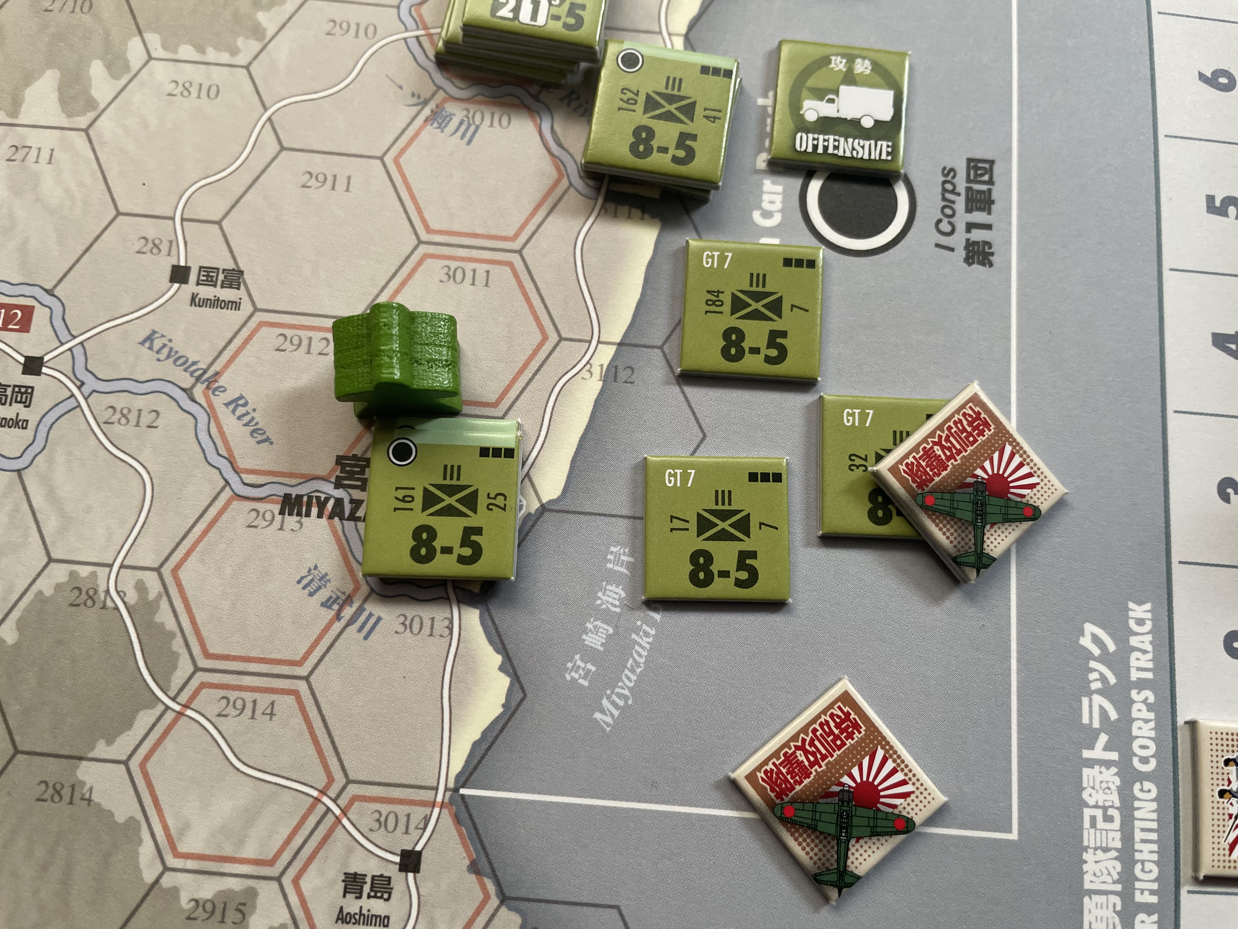 With time running out—and good weather—the Americans push hard in Turn 10 of Kyüshü 1945. Or at least they tried. With Kagoshima Port in hand the Americans earned a third Offensive chit. Unfortunately for the Americans, the Offensive designated to support the I Corps Headquarters was stopped by a Japanese “Tokko” attack. In the Mount Kirishima area the battling was slow as the Americans tried to push the Japanese off the mountain; even efforts to go around them are stymied by Zones of Control or other units sitting in defensible terrain. Along the Omaru River facing I Corps, two regiments of the American 25th Infantry Division with one regiment of the 41st Infantry Division attacked Japanese defenders in Tsuno. Taking Tsuno would be the final Victory location needed. The attack goes in with extensive off-shore Naval Support and…fails to dislodge the Japanese.