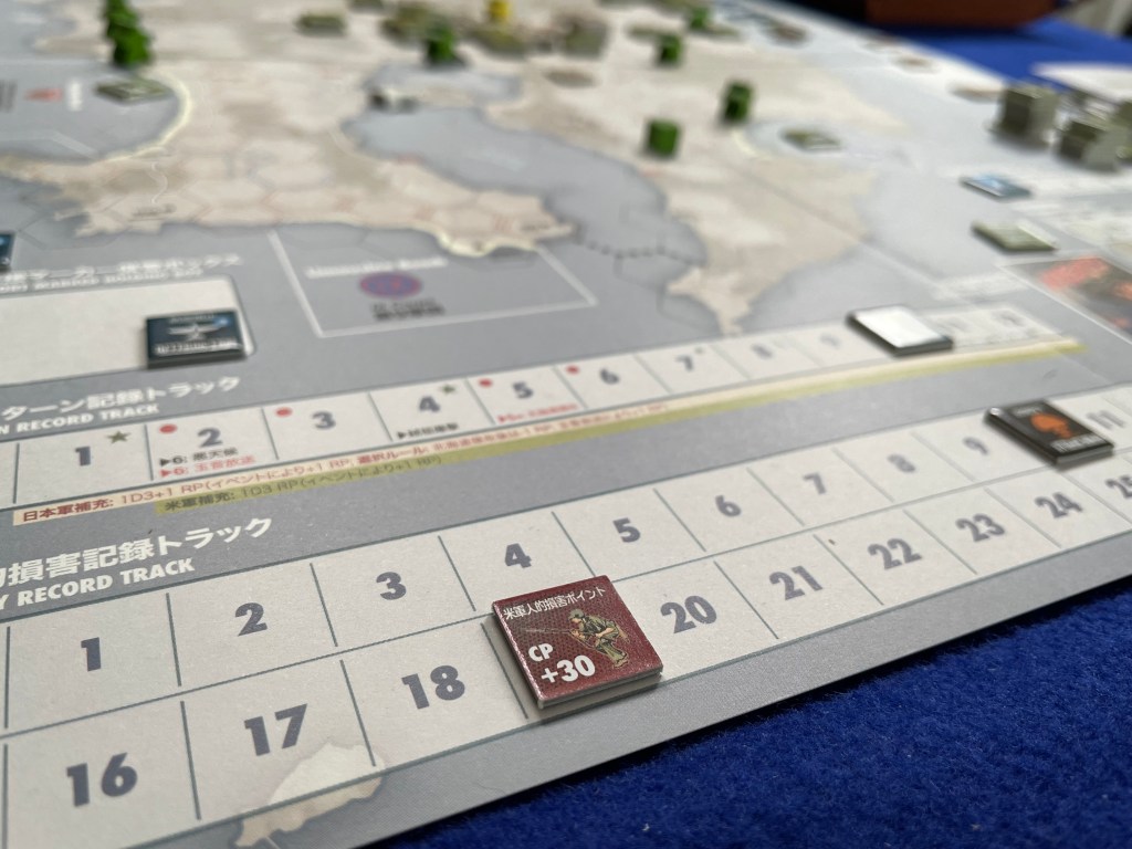 [While the Americans are solidly ashore, the Casualty Track shows 10 step losses. Given the Japanese need 60 for an automatic victory, and this is but the end of turn one of 12 possible, the Americans can ill-afford to maintain this rate of losses. On the plus side—for the Americans—there is a possibility that as many as four of the 10 locations needed for victory may be secured over the next few days (game turn).]