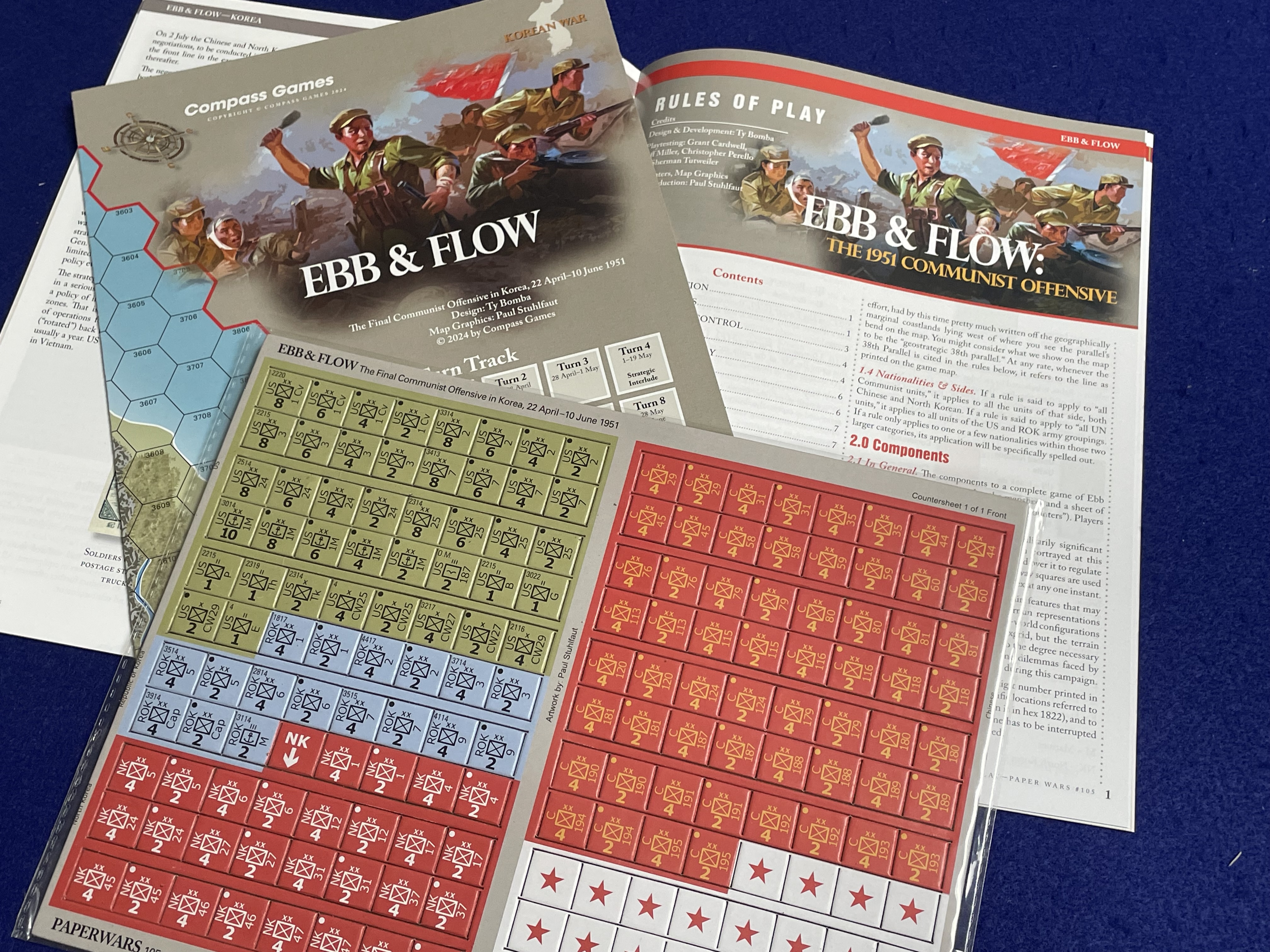 In February 2024, I covered Ty Bomba’s then-new wargame Ebb & Flow: The Final Communist Offensive in Korea, 22 April-10 June 1951 printed in Paper Wars #105 (Compass Games, 2024). While Korea 38th and Ebb & Flow both cover the early days of the Korean War (Ebb & Flow taking place in Turns 11-13 of Korea 38th) the two games are of sufficiently different scale that they complement rather than compete with one another.