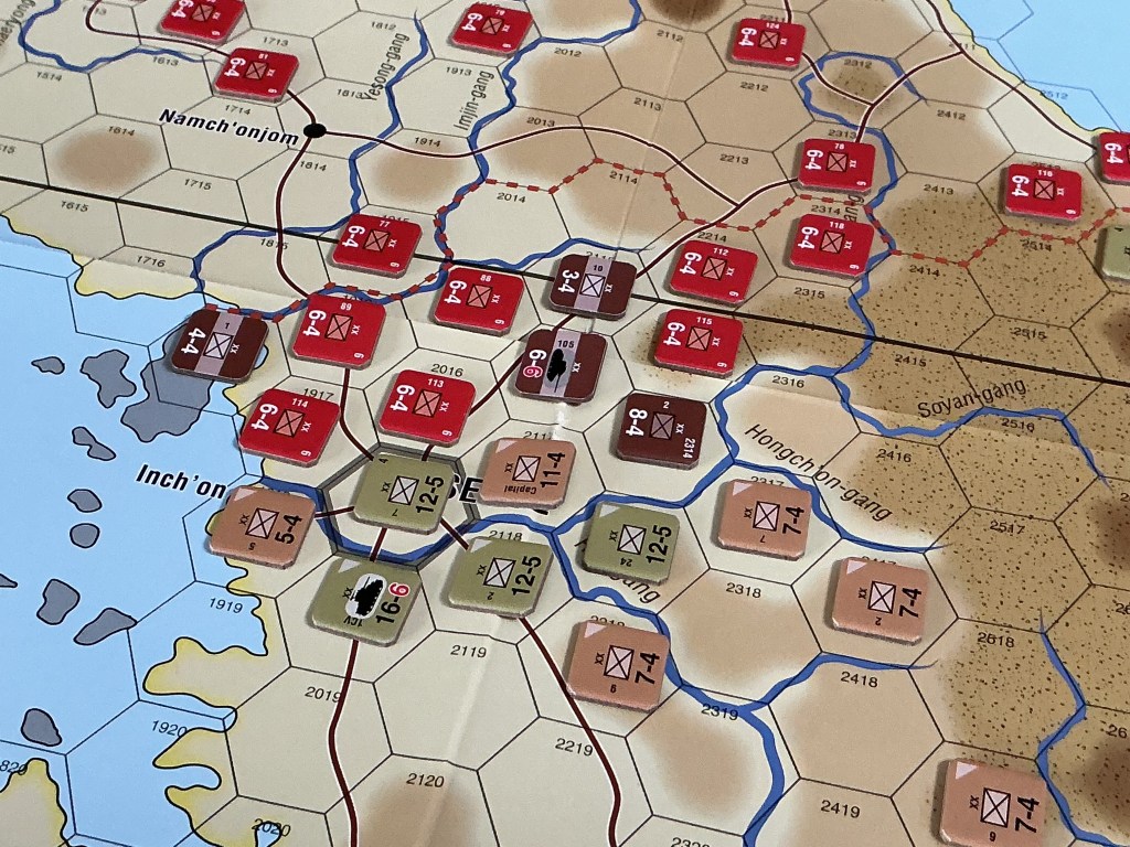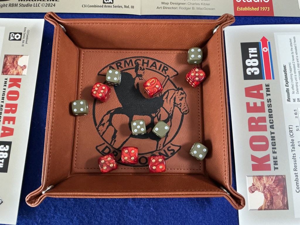 [Unlike my last several play throughs of By Swords & Bayonets (GMT Games, 2025), Inflection Point (MultiMan Publishing, 2025), and Battle for Moscow (C3i/RBM Studios 2025), Lady Luck seemed a bit more comfortable allowing the dice to roll in a more “average” manner when I played Korea 38th. I hope my days of consistently rolling low dice in a wargame are past.]