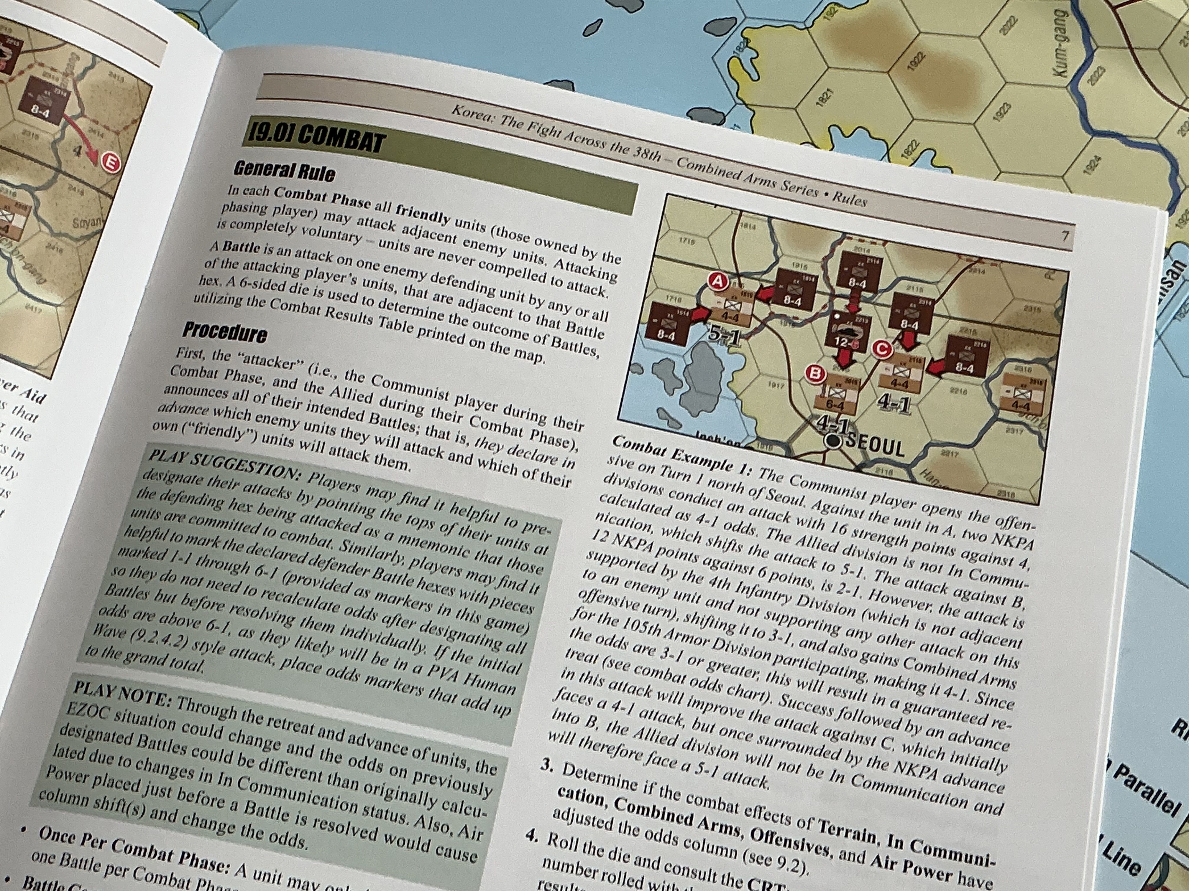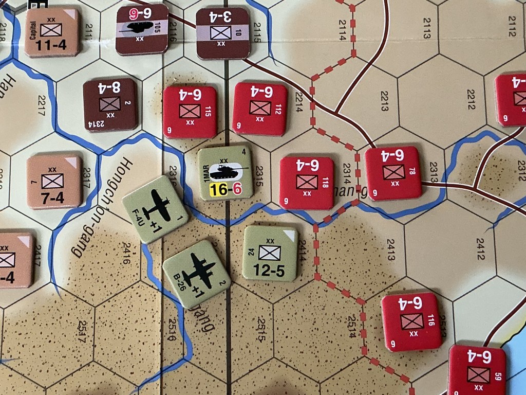Combined Arms. Once the Chinese arrive the Allies are outnumbered roughly 2:1 in terms of numbers of formations. Much of the terrain along the 38th parallel or the final DMZ line is only marginally favorable for defense. The key to the Allies leveraging the Chinese out of a hex is to use combined arms, be it a combination of armor and infantry on the attack or supporting air power. On the Chinese side, the November 1950 through January 1951 turns are key as those are both Surprise and Offensive turns that unlock not only extra Pre-Combat Movement but also only Offensive Support and Human Wave Attacks.