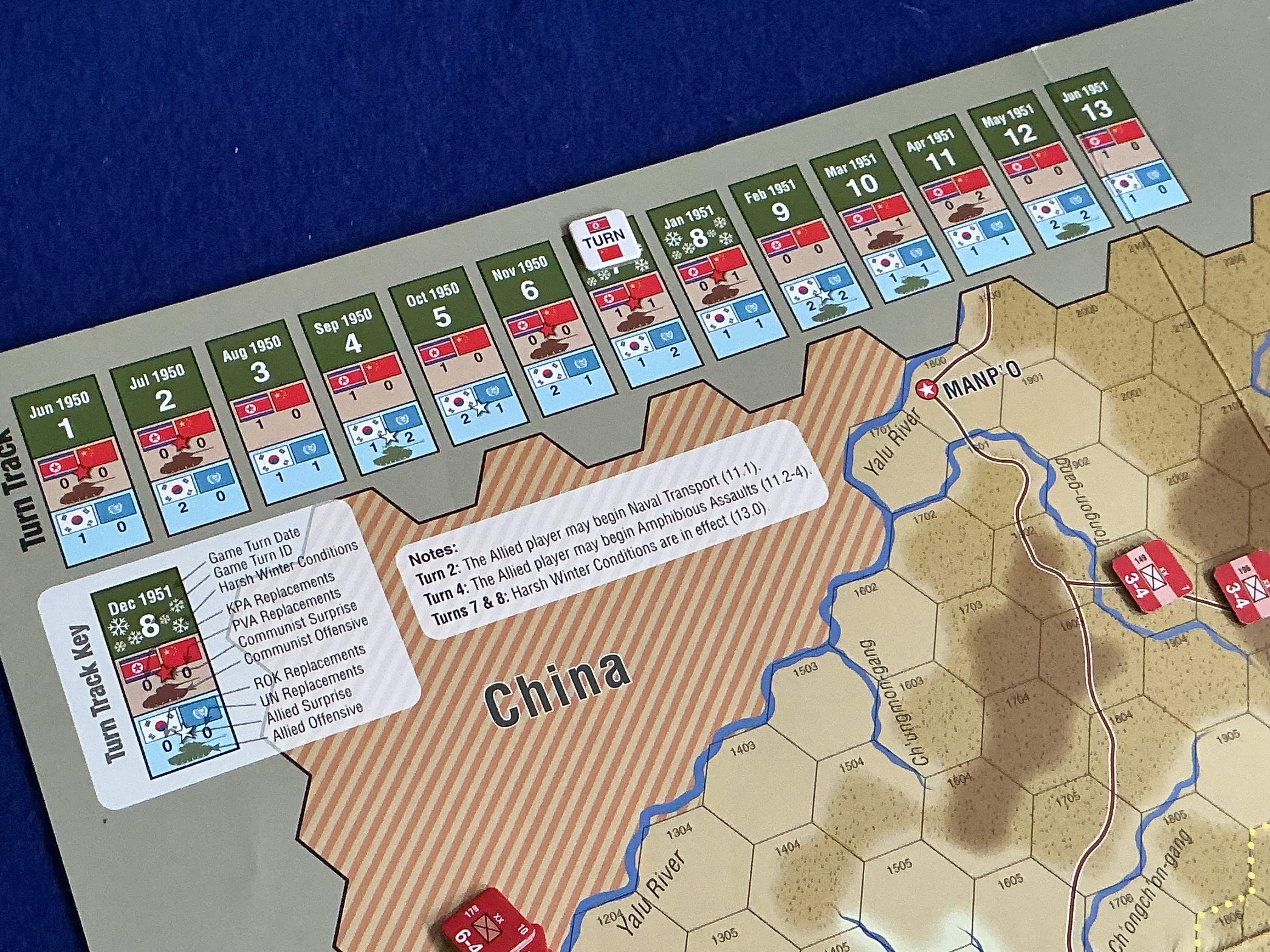 - Harsh Winter. Turns 7 and 8 (December 1950 and January 1951) are designated Harsh Winter Conditions. During these turns there is not Road Movement bonus north of the 38th Parallel and Allied Air Points are reduced by half. See [13.0] HARSH WINTER CONDITIONS.