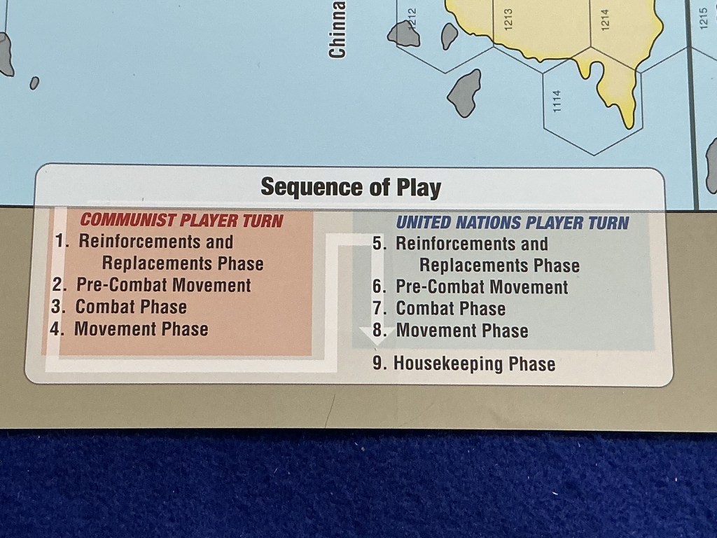 Charts. In keeping with its component simplicity, the few charts used in Korea 38th are readily available either on the map or on the Player Aid cards. The four that are most commonly used appear on the game map; this is, the Sequence of Play, the Battle Sequence, the Combat Results Table (CRT), and the Terrain Key. The double-sided Player Aid cards have the Terrain Effects Chart on one side and a repeated CRT and both Sequence charts along with four other commonly used rules sequences—Pre-Combat Movement, Determining in Communication, Determining Unit Isolation & Attrition, and Victory Conditions.
