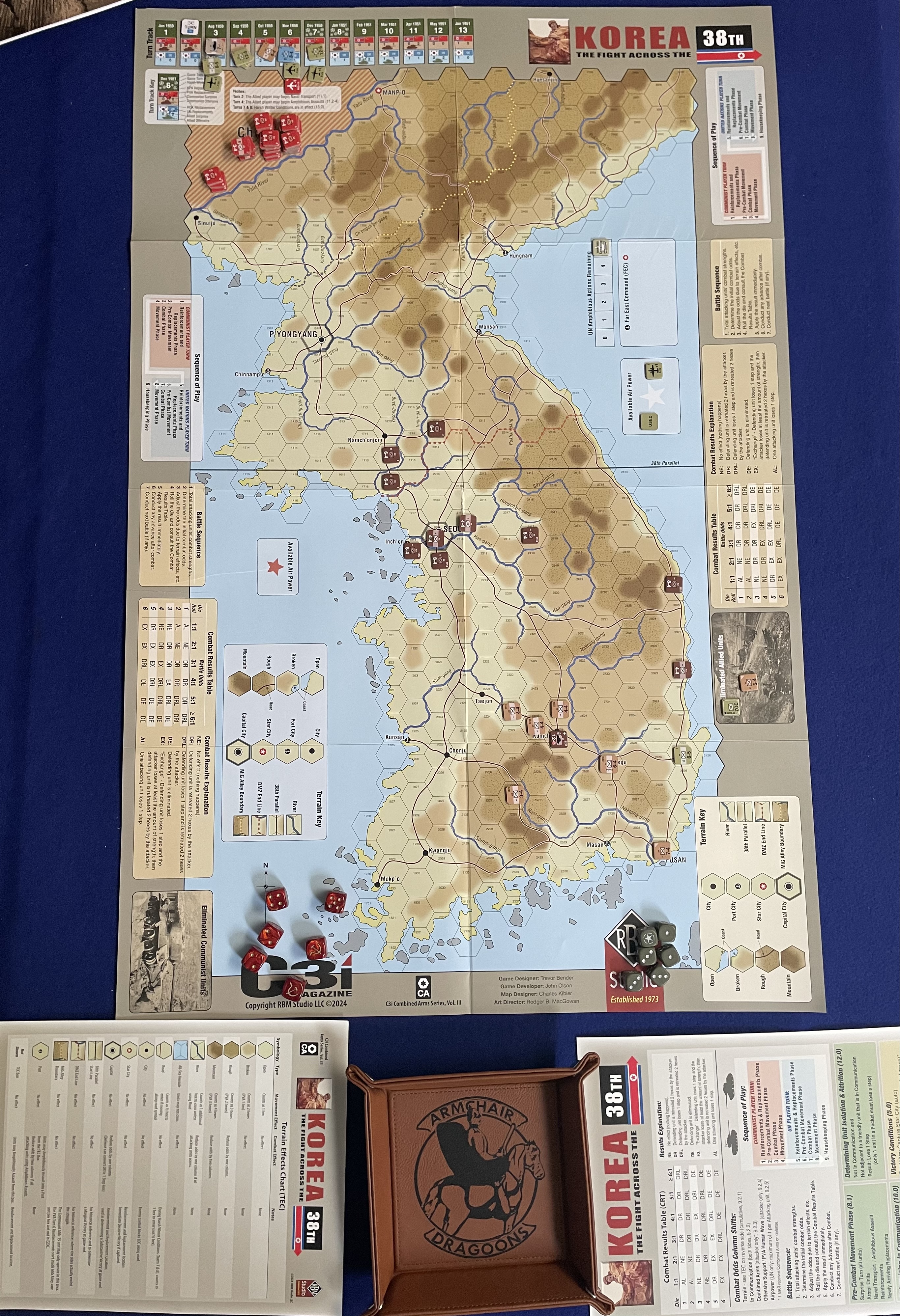 A simple search of BoardGameGeek using the term “Korea” returns 30-plus wargames on the ground campaign of the Korean War; that is, once you exclude air combat wargames and titles concerned about the next Korean War. That just about makes Trevor Bender’s new entry in the C3i Combined Arms series, Korea: The Fight Across the 38th from RBM Studios and published in C3i Magazine Nr. 38 (2025), the 38th wargame on the Korean War. Korea: The Fight Across the 38th (aka Korea 38th) is an easy-to-learn, easy-to-play, low-complexity wargame that recreates the narrative beats of the first year or so of the Korean War in an engaging manner.