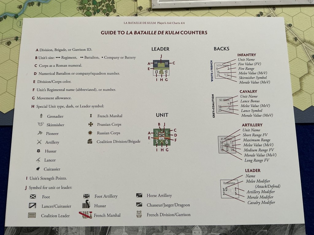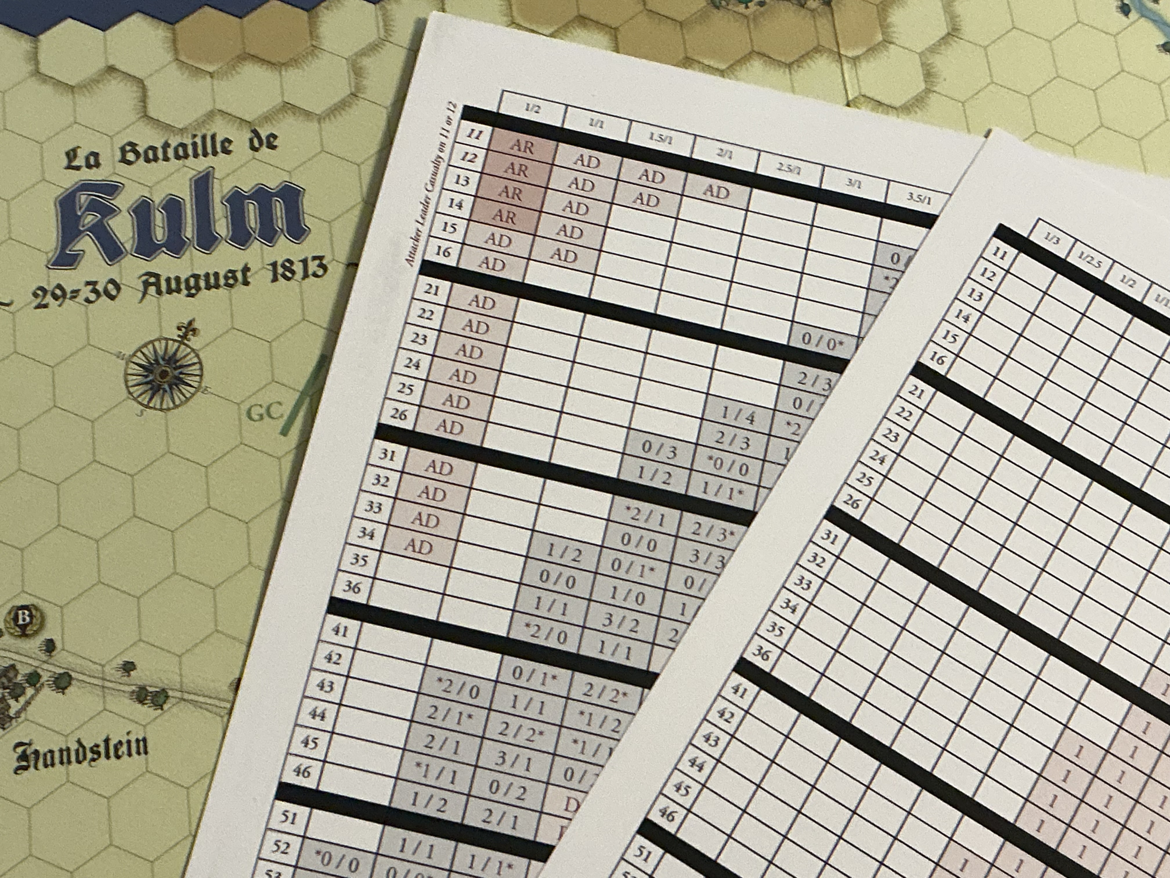 Charts. La Bataille de Kulm relies on several page-sized Player Aid Cards (called PACs in the Rules of Play) printed on cardstock to deliver all the charts and tables necessary for play. The various charts include: