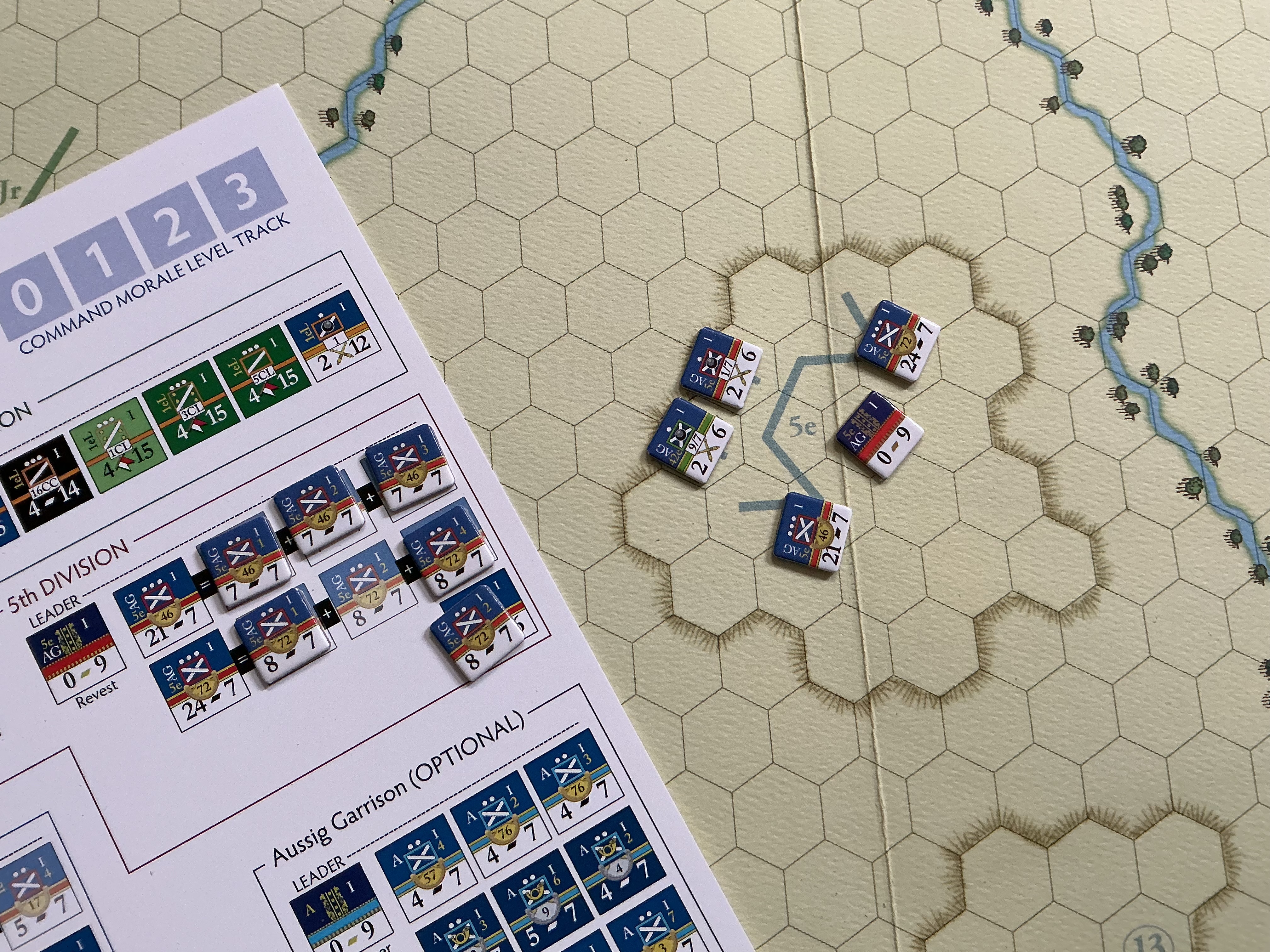 When setting up the scenario, the reason behind various markings on the map becomes apparent. For instance, in scenario 17.1 the French Advance Guard 5e Division (AG/5e) deploys at ‘5e” on the map. It was at this exact moment I realized that the map for La Bataille de Kulm has no hex numbers! During set up it also became obvious that any corner tuft on the small 1/2″ counters sitting in 15mm hexes was not going to work. Hence, I summoned my 2mm Corner Rounder for action….