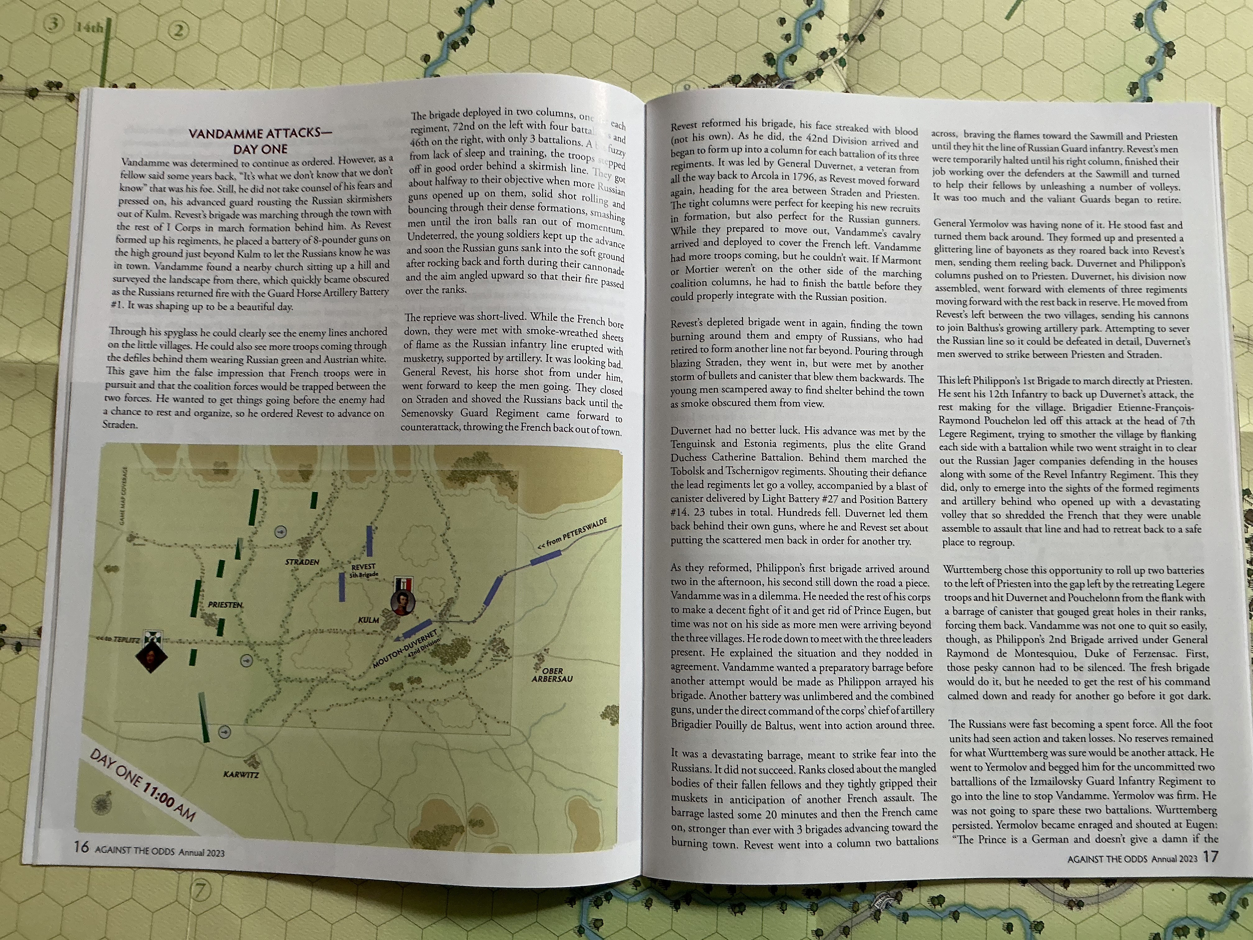 Rules. The Rules of Play for La Bataille de Kulm are in a 24-page pull-out from the center of the Against the Odds Annual 23. A bit annoyingly, within the Rules of Play is a 4-page pull-out for the La Vendée – 1815 Variant Game. I wish the rulebook had been stapled separate from the Annual; the pages are free once you open the staples of the Annual to remove the rulebook inserts. The 24-pages of the Rules of Play for La Bataille de Kulm are in triple column in a bit of a small font. As dense as the rules are, the use of Case System formatting with color, along with some graphics, keeps the rules fairly readable. The core rules for La Bataille de Kulm are covered in about 18 pages with one-plus page (four columns) for the game-specific special rules. Four scenarios are provided on three more pages. The final page of the Rules of Play is an extended Melee example with a large graphic.