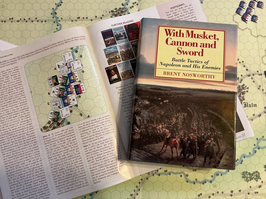 [As the afternoon was turning to evening and I had been standing over my gaming table most of the day, I relaxed after dinner by thumbing through my copy of With Musket, Cannon and Sword: Battle Tactics of Napoleon and His Enemies by Brent Nosworthy.2 Twenty years ago Nosworthy’s book was recommended to me as a good study on Napoleonic tactics. While I am not sure it is as highly praised today as it was nearly 30 years ago, I nonetheless learned much in my reading opportunity. In particular, I closely read “Part Two: Grand Tactics in the Napoleonic Era.” I eventually must read “Part Three: Infantry Tactics” and “Part Four: Cavalry and Artillery Tactics” but those are around 75 and 140 pages, respectively.]