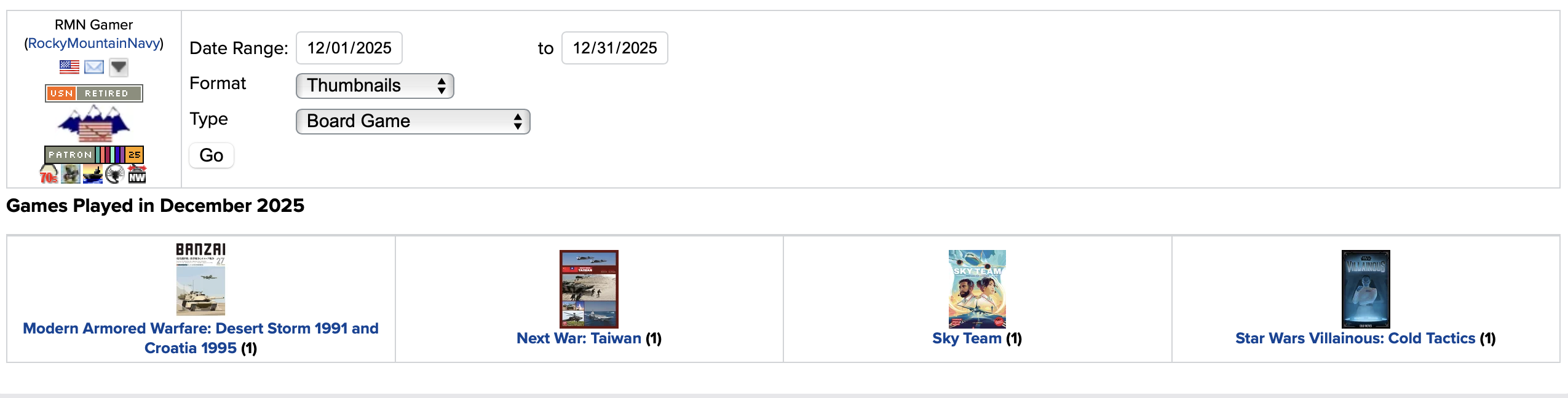 Although the date range is a month the record actually reflects the record of a single day, in this case New Year’s Eve. On New Year’s Eve I worked (about an hour) on translating the rules for Modern Armored Warfare and (about an hour) on my major review of Next War: Taiwan 2nd Edition. I also “played” Sky Team (single game ~25 minutes) and Star Wars: Villainous Cold Tactics (single learning game ~30 minutes).