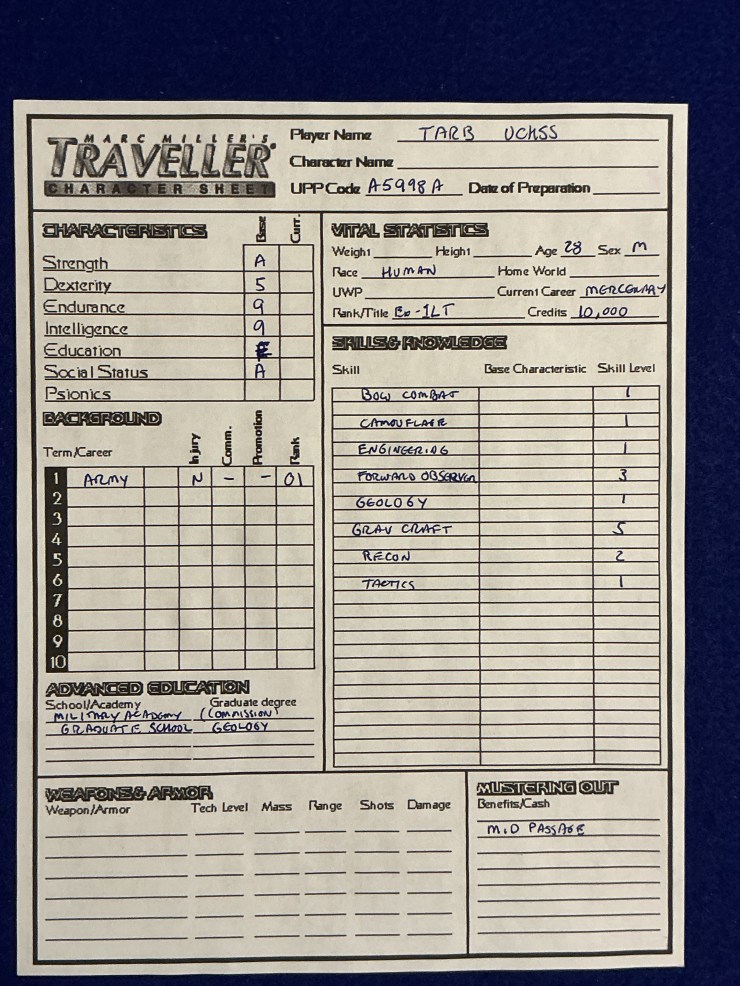 When making a Traveller character, I really love the randomness. There is an entire game to be played just dreaming up what the various die rolls mean. For example take my character, Tarb Uckks. Although hailing from a relatively well-off world Tarb is—how shall we say it—a bit clumsy (Dexterity 5). His family, however, appears rather well off (Social Status A).1 He ends up in the Military Academy (barely as he rolls a [2] with a +2 die modifier from his social status and must roll a 4 or less). He then barely gets into Graduate School and then barely survives his first term. Yet, he is also a legendary Grav Craft driver with Skill Level 5.
