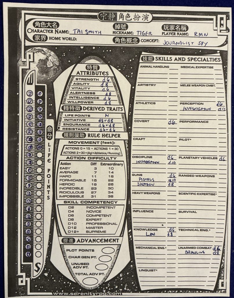 Not shown on the front of the character sheet (why?) are ‘Tiger’s’ Assets of Natural Linguist (Minor) and Sharp Sense (Minor). His Complications are Credo (Minor) and Forked Tongue (Minor).