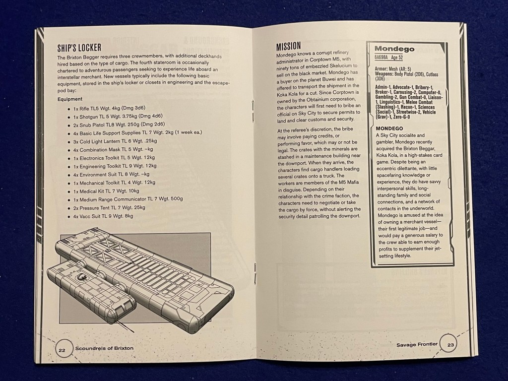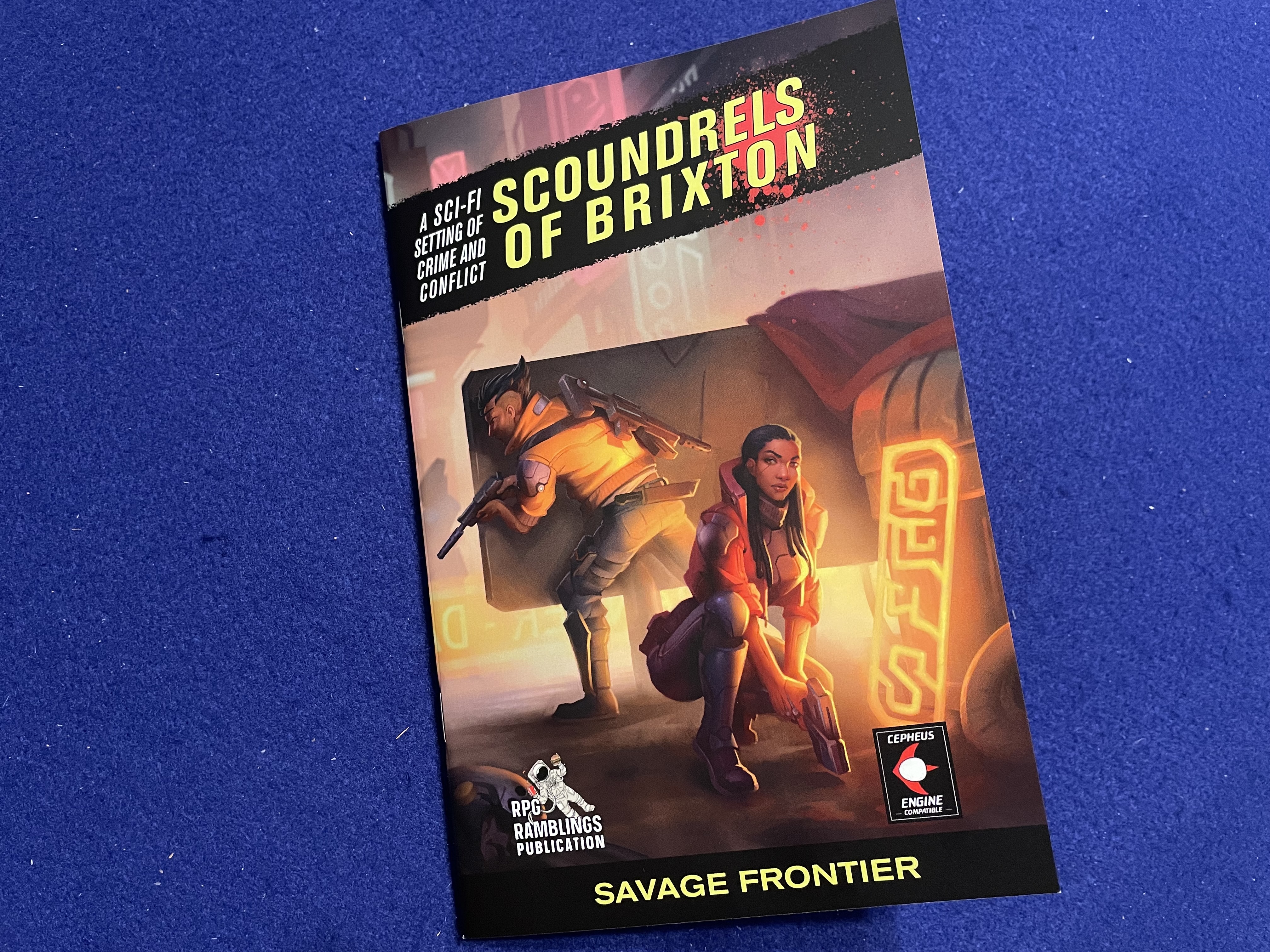 Scoundrels of Brixton: Savage Frontier by Jeffrey Jones (Creator-Designer) and Adam Kovac (Writer-Developer) is the fourth and latest booklet in the Scoundrels of Brixton series from RPG Ramblings. These slim booklets—48 pages and digest-sized like the original Traveller Little Black Books—provide, “A Sci-Fi Setting of Crime and Conflict.” Scoundrels is Cepheus Engine compatible which means you get to choose which flavor of Cepheus Engine you prefer to play.