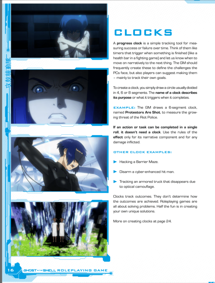 In play, Ghost in the Shell ARISE TTRPG uses Clocks to track progress or danger. Clocks can have between 4 and 8 segments.