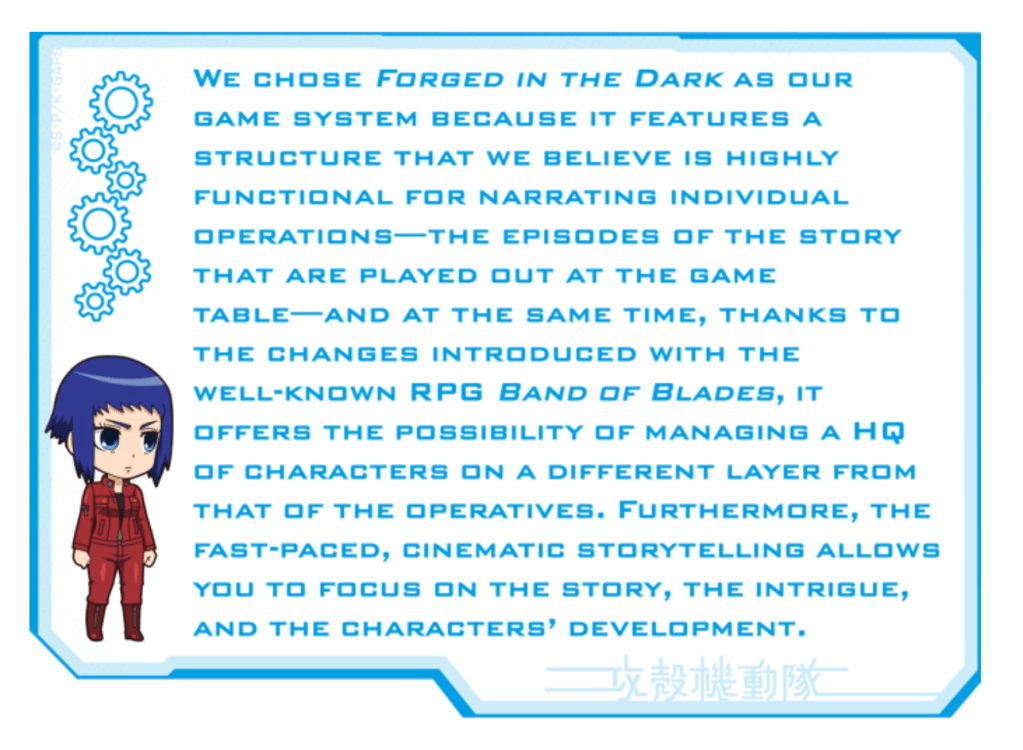 The Ghost in the Shell ARISE TTRPG Quickstart is produced by Mana Project Studio, the same producer of the Cowboy Bebop Roleplaying Game. I own and struggle with the Cowboy Bebop RPG which uses a similar game engine derived from Blades in the Dark (or, more correctly, the Forged in the Dark game engine).