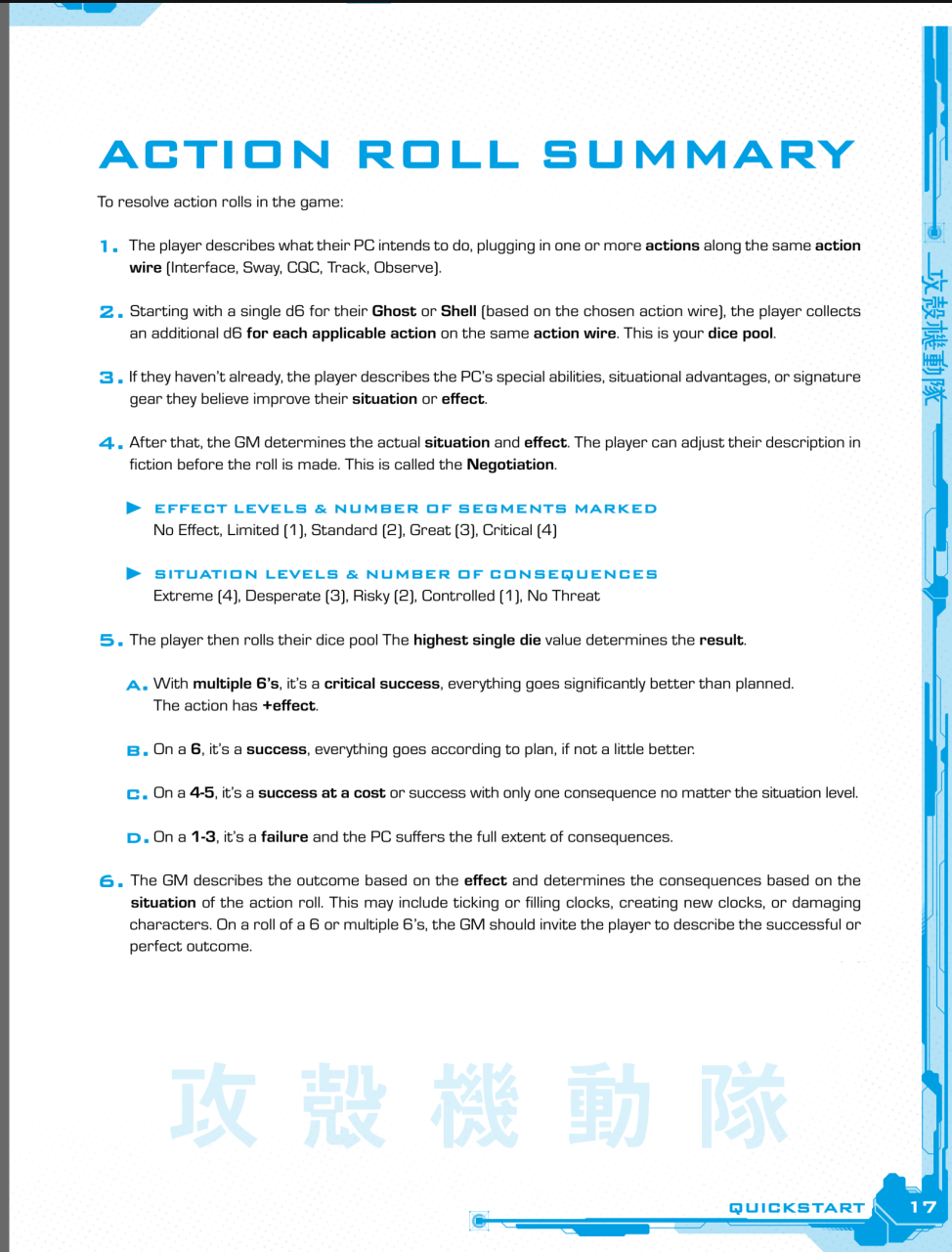 The core game mechanism in Ghost in the Shell ARISE TTRPG uses a pool of d6. Players first select which Attribute to use (1d6) and then which Action Wire to employ, gaining an additional d6 for each action along that wire. The pool is rolled with multiple 6’s being a critical success, a single 6 a success, and 4 or 5 being success at a cost, and 1-3 as a failure. The results are compared against the Situation and Effect and determines the number of Clock segments marked off.