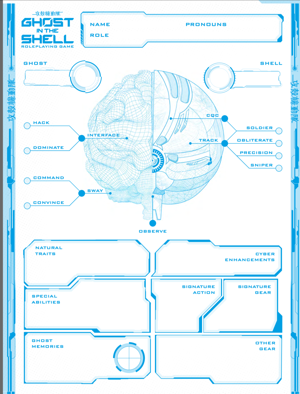 Fortunately, the Ghost in the Shell ARISE TTRPG does not go (quite) that far. Characters in the Ghost in the Shell ARISE TTRPG are built using a Playbook (i,.e. archetype) and described in terms of a Ghost (mental) and Shell (physical) Attributes, each of which has Actions are tied to them.