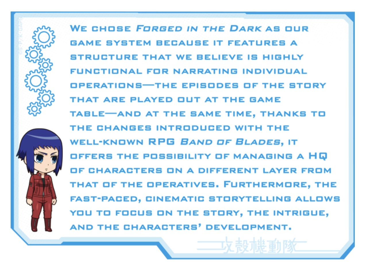 The Ghost in the Shell ARISE TTRPG Quickstart is produced by Mana Project Studio, the same producer of the Cowboy Bebop Roleplaying Game. I own and struggle with the Cowboy Bebop RPG which uses a similar game engine derived from Blades in the Dark (or, more correctly, the Forged in the Dark game engine).