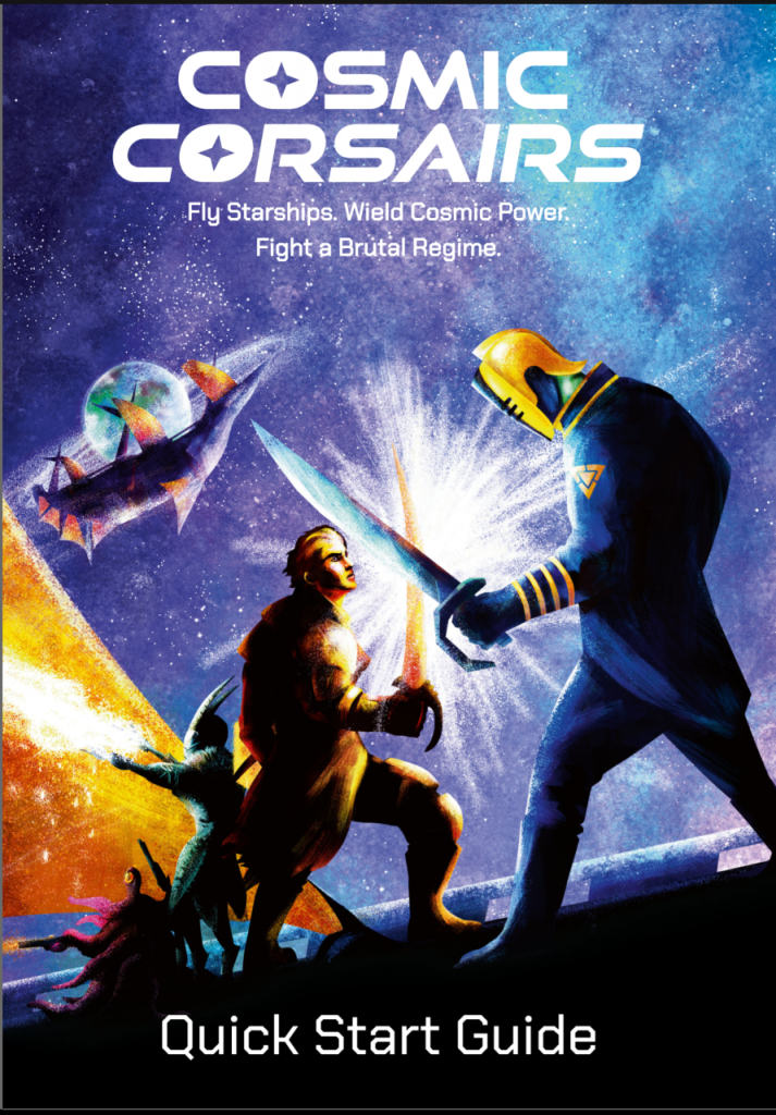With that introduction there certainly is no other way for me to look at the Cosmic Corsairs roleplaying game (RPG) than as a kind of steampunk superhero setting. Frankly, the steampunk-like superhero genre is not really my thing but I went ahead and picked up the Quick Start Guide to sample given my previous experience with Nerdburger Games; specifically Code Warriors (2022) which I enjoy. What I found is a rules-lite game system (Roll Track) that encourages fast play.