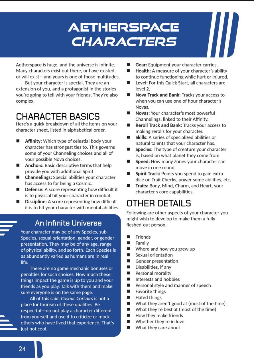 Characters in Cosmic Corsairs are easy to create and play thanks to a very streamlined character generation process. In terms of narrative versus crunch game mechanisms, Cosmic Corsairs comes down—for characters—more on the narrative side. Personally, I am not sure just how much a superhero in Aetherspace needs to worry about their Sexual Orientation or their Gender Presentation but, well, if that is important to your gaming group then more power to you.